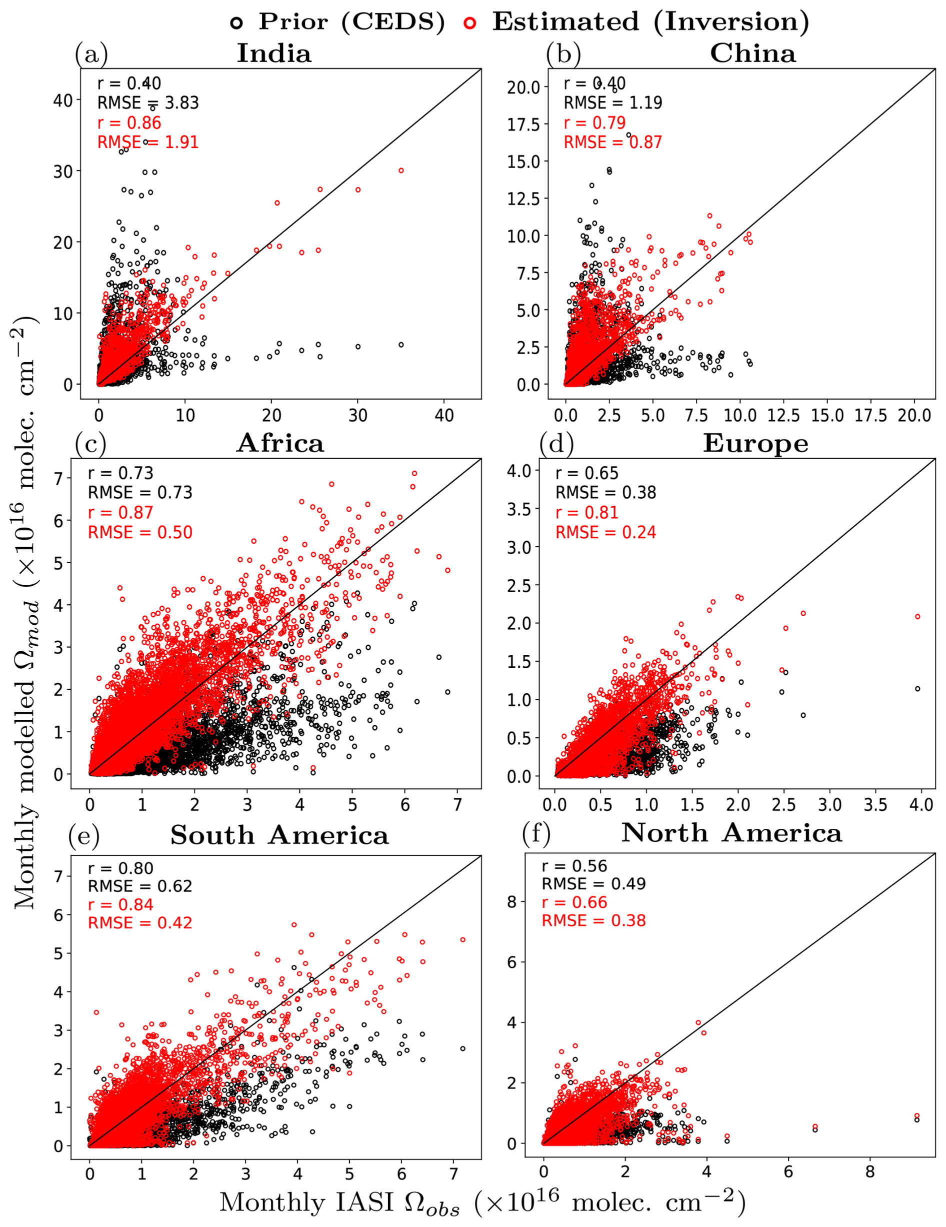 Figure 4Comparison of the monthly averages of the gridded IASI NH3 column observations (Ωobs) over the model horizontal land grid cells at 1.27° × 2.5° resolution to the corresponding averages of these observations with two simulations of LMDZ-INCA (Ωmod) using the IASI-constrained NH3 emission estimates derived from our global inversions (red) and using the prior CEDS NH3 emissions (black) over different regions for the year 2019. Each panel shows the correlation coefficient (r) and root mean square error (RMSE) between modeled (from both prior and IASI-constrained NH3 emissions from inversions) and observed IASI NH3 columns. The black line denotes the one-to-one line.