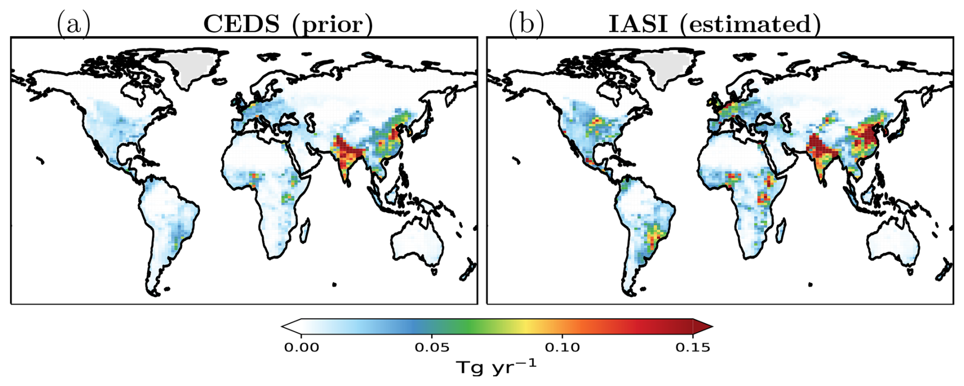 In recent years, numerous studies have used satellite observations, mostly IASI and CrIS, to estimate NH3 emissions over specific regions (Cao et al., 2020, 2022; Chen et al., 2021; Ding et al., 2024; Fortems-Cheiney et al., 2020; Tichý et al., 2023; Xia et al., 2025) or across the globe (Dammers et al., 2022; Evangeliou et al., 2021; Luo et al., 2022). Some recent regional-scale inversion studies over the USA (Cao et al., 2020; Chen et al., 2021), China (Jin et al., 2023; Momeni et al., 2024), UK (Marais et al., 2021), and Europe (Cao et al., 2022; Ding et al., 2024; van der Graaf et al., 2022) show approximately 20 %–100 % differences between the inversion-based and the bottom-up NH3 emissions. The NH3 inversion problem raises challenges and requires a high spatial resolution of the emissions because the NH3 emissions are highly localized due to the short lifetime of a few hours to a day of ammonia in the atmosphere. The impact of the atmospheric chemistry challenges the linearization underlying the traditional inversion approaches or the use of relatively simple models of the atmospheric chemistry and transport. The conventional variational or Kalman filter approaches, which are among the most sophisticated ones, have been used for regional-scale inversions (Cao et al., 2020, 2022; Ding et al., 2024; Jin et al., 2023). However, covering the globe at a suitable spatial resolution represents an inversion problem whose dimensions make the application of such approaches very demanding in terms of computational cost. That is probably why, compared to regional studies, global inversions of NH3 emissions based on satellite observations are relatively scarce (Van Damme et al., 2018; Dammers et al., 2022; Evangeliou et al., 2021; Luo et al., 2022). Studies such as Van Damme et al. (2018) and Dammers et al. (2019) covered emissions worldwide but focused on the detection and estimation of NH3 large point sources or hotspot areas. Using high-resolution maps of atmospheric ammonia from IASI, Van Damme et al. (2018) detected 248 NH3 hotspot locations and large source regions across the globe and reported that the satellite-data-constrained NH3 emissions for the source regions vary within a factor of 3 from the corresponding estimates extracted from the Emissions Database for Global Atmospheric Research (EDGAR) emission inventory. However, the emissions from these detected large NH3 point sources or source regions account for only a small fraction of the overall global NH3 emissions budget (Dammers et al., 2019). For instance, the cumulative NH3 emissions from the 249 point sources identified by Dammers et al. (2019) contributed to merely 5 % of the total global NH3 emissions in the Hemispheric Transport Atmospheric Pollution version 2 (HTAPv2) inventory.