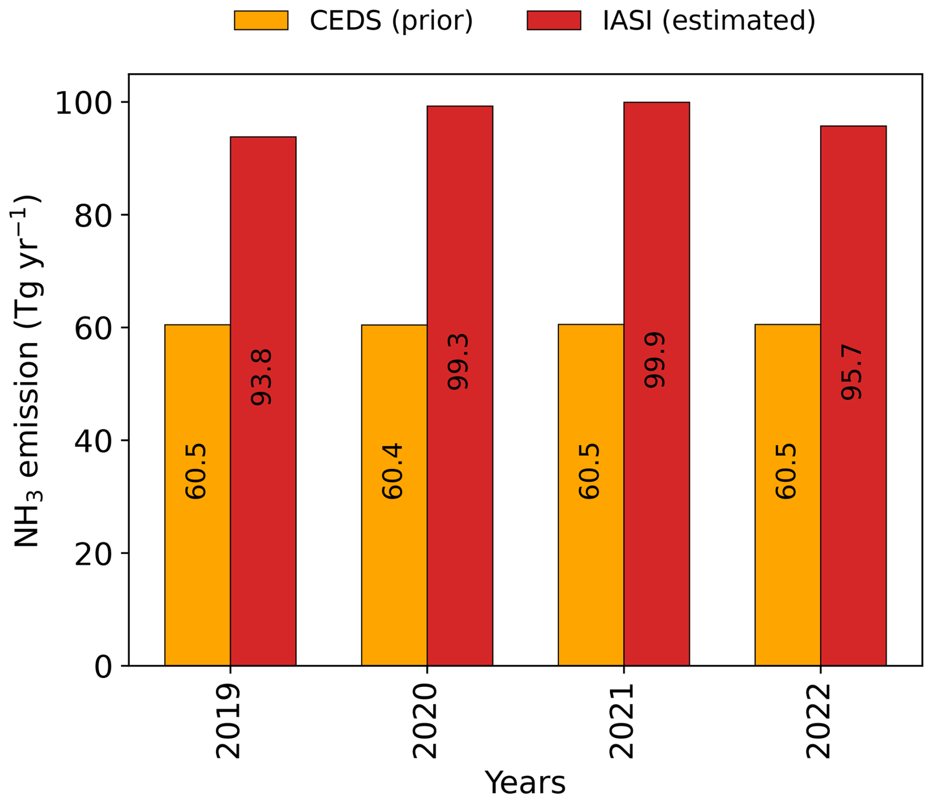 Bottom-up NH3 emission inventories provide data on NH3 sources and their emissions (Beaudor et al., 2023; Bouwman et al., 1997; Vira et al., 2020), enabling their integration into atmospheric chemistry transport and climate models to simulate atmospheric ammonia concentrations and making it possible to assess the impacts of NH3 emissions. However, significant uncertainties are inherent in bottom-up NH3 emission inventories across spatiotemporal scales (Behera et al., 2013; Luo et al., 2022; Sutton et al., 2013), stemming from the constraints of limited NH3 emission activity data and emission factors, high uncertainty of agriculture statistics, and a lack of recent information (Chen et al., 2021; Crippa et al., 2018; Xu et al., 2019). In situ measurements are essential for accurately developing NH3 emission inventories and for the inversion of NH3 emissions, as well as for evaluating these emissions. However, the scarcity of in situ NH3 measurements worldwide contributed to significant uncertainties in NH3 emissions and in our understanding of NH3 sources and their distributions (Zhu et al., 2015). Advancements in satellite measurements of columnar NH3 abundance in the atmosphere in the past decades provide high-spatiotemporal-resolution column concentration data, and inversion methods are progressively enhancing our ability to derive NH3 emissions. For the atmospheric inverse modeling of the NH3 emissions, satellite observations offer valuable data density and coverage, thus mitigating some of the limitations of the use of in situ NH3 measurements, enabling a more comprehensive assessment of NH3 emissions. The recent NH3 emission estimates based on satellite observations exhibit significant differences at both regional and global scales when compared to those reported by the bottom-up inventories (Cao et al., 2020; Chen et al., 2021; Van Damme et al., 2018; Luo et al., 2022; Evangeliou et al., 2021; Dammers et al., 2022). However, the satellite data also have some limitations, often lacking clear signals from the emissions outside the strongly polluted regions, bearing potential errors due to interference from other atmospheric constituents and the complexity of their validation and calibration, and being sensitive to cloud cover, providing incomplete coverage in certain regions in the presence of clouds.