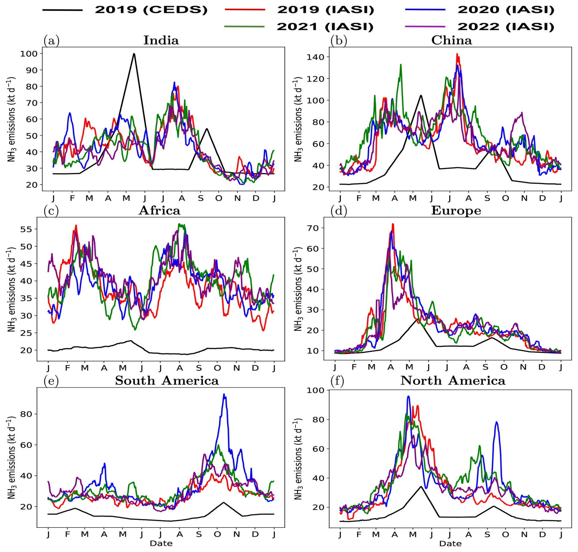 Figure 7 illustrates the daily (at 10 d scale) variation of estimated NH3 emissions for 4 years from 2019 to 2022 over the six specific regions, i.e., India, China, Africa, Europe, North America, and South America (defined in Fig. S6), which have the major anthropogenic ammonia emissions. In this figure, the prior CEDS anthropogenic NH3 emissions of the year 2019 over the globe and over land areas are almost the same in magnitude and seasonal variation across the 4 years (Fig. 6), and thus the representation is shown only for the year 2019. Figure 8 shows the spatial distributions of the 4-year-averaged annual IASI-constrained NH3 emissions and the prior CEDS emissions over the six regions. The budgets of the regional annual estimated and prior NH3 emissions over the 4-year period for these selected regions are presented in Fig. 9.