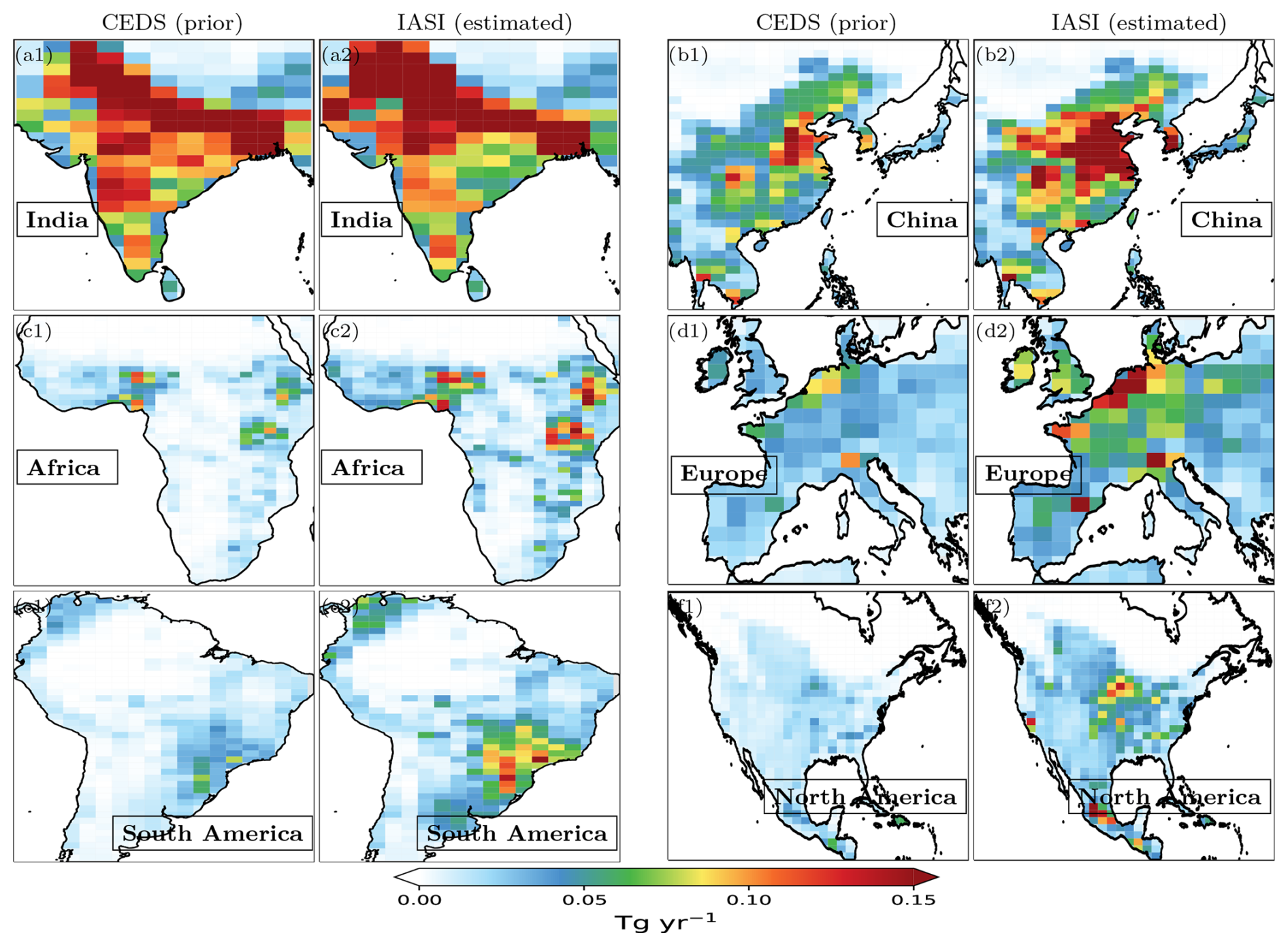 In our LMDZ-INCA model setup and inversion framework, the CEDS inventory emissions are regridded to match the model resolution. While this inevitably misses some fine-scale features, our study focuses on the broader regional patterns of NH3 emissions rather than point-source inversions. The inversions at higher resolution, based on high-resolution regional inventories (e.g., MEIC, NEI, and CAMS-REG) and high-resolution chemistry transport model simulations can bring more robust information of the more localized NH3 sources such as point sources at sub-national scales. However, the above-mentioned limitation, i.e., the spatial smearing effect (ignoring the advection across the chemistry transport model grid cells) of the FDMB inversion approach, would be exacerbated at such a higher resolution. Even if an iterative FDMB approach is used to overcome this smearing effect at finer resolutions, errors in the derived emission estimates can be amplified (Li et al., 2019). Therefore, application of such an inversion approach at the finer resolution may have limitations in accurately estimating the NH3 emissions.