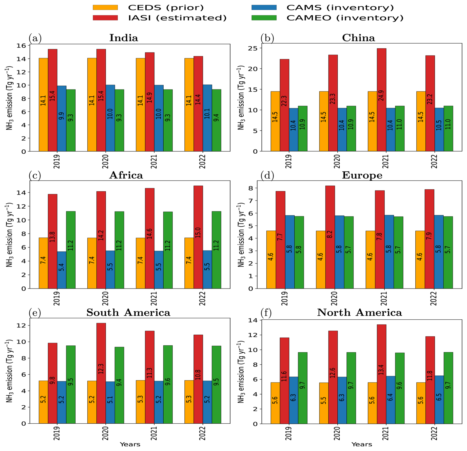 Figure 9The regional annual NH3 emissions spanning from 2019 to 2022 over the six regions over land areas, derived from the IASI-constrained daily global estimates, the prior CEDS inventory anthropogenic NH3 emissions, and two independent global bottom-up inventories: CAMS (anthropogenic NH3 emissions) and CAMEO (combined agriculture and natural soil NH3 emissions). The CAMEO NH3 emissions are for the last available year, 2014, selected on the common grids of each year's estimates.
