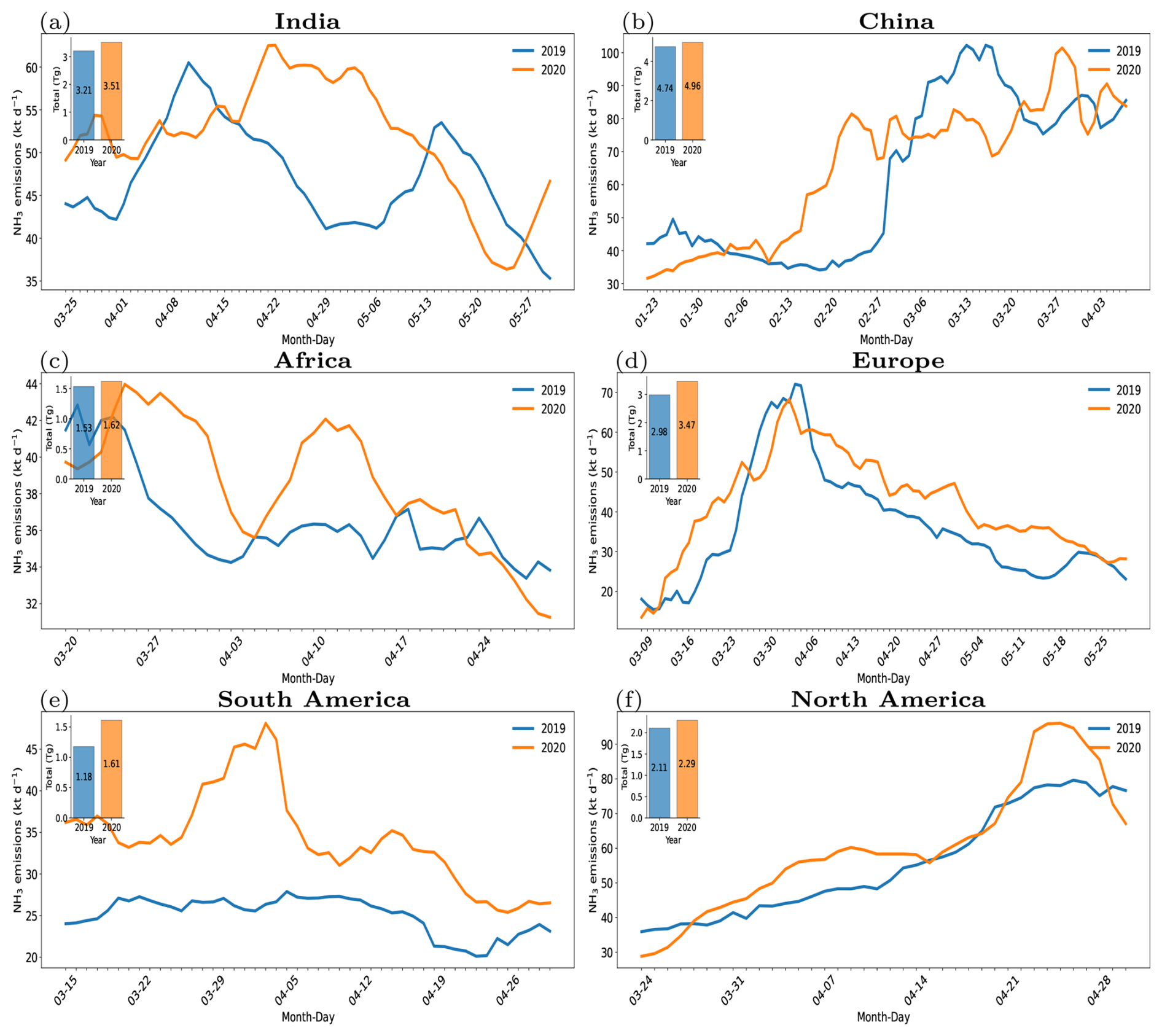 From our atmospheric inversions, we observe that the annual NH3 emissions worldwide and across all the selected six regions in the COVID-19 lockdowns in the year 2020 are higher compared to those in the pre-COVID year 2019 (Figs. 6 and 9). Lockdown periods varied across different regions, countries, and cities. However, following the first lockdown in China in the second-to-last week of January 2020, the majority of the first major lockdowns worldwide were implemented between March and May during that year. We defined the lockdown periods in 2020 using the most consistent common dates that aligned with the major lockdowns in each region. Figure 10 compares the estimated daily NH3 emissions time series and total NH3 emissions during the COVID-19 lockdown periods in 2020 with the estimated NH3 emissions during the corresponding period in pre-COVID year 2019 across six regions. Daily (at 10 d scale) variation of the NH3 emissions during the lockdown periods in 2020 is mostly higher compared to that in the same period in 2019 (Fig. 10). The total NH3 emissions across these regions in 2020 during the lockdown periods increased by a minimum of ∼5 % (in China) to a maximum of ∼37 % (in South America) compared to the total emissions in this period in 2019 (Fig. 10). The total NH3 emissions during the lockdown periods in 2020 compared to 2019 across India, Africa, North America, and Europe increased by ∼10 %, ∼6 %, ∼9 %, and ∼16 %, respectively.