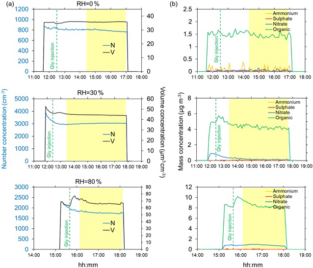 Figure 1 shows that in dry conditions, there is no significant variation of either the aerosol number or the volume concentrations, nor the chemical composition (including organics) following the glyoxal injection.