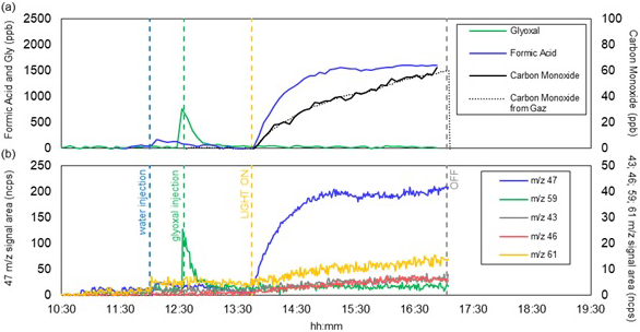 Figure 2Time series of the gas-phase composition observed during experiment D15: (a) concentrations of carbon monoxide, glyoxal and formic acid measured by FTIR (for CO, the measurements of the online analyser are also shown); (b) various VOC ions (m/z 47, 59, 43, 46 and 61) measured by the PTR-MS. Ion signals measured by PTR-MS are normalized by signals of reagent ions (i.e. H3O+ and H3O+(H2O)) and therefore expressed in normalized counts (ncps). The blue vertical dashed lines indicate the injection of water in the chamber; the green vertical dashed lines indicate the injection of glyoxal in the chamber, the yellow dashed lines indicate the beginning of irradiation, and the grey dashed lines indicate the end of irradiation.