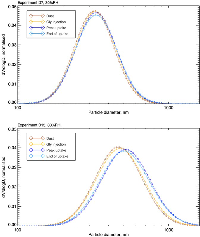 All distributions have a single mode. However, after the injection of glyoxal, the geometric mean volume diameter, measured at the maximum POM concentration, increases by up to 10 % (from 310 to 340 nm) at 30 % RH, and up to 20 % (from 450 to 540 nm) at 80 % RH. Interestingly, even at the end of the experiment, when the POM concentration returns to its initial value, the increase in geometric mean diameter of the aerosol is irreversible. We hypothesize that the uptake of glyoxal enhances the dust hygroscopicity. Therefore, the difference in total volume between the beginning and end of the experiment is due to formed organic aerosol mass, resulting from water uptake.