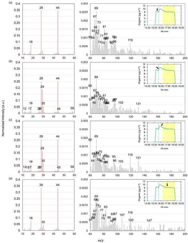 The glyoxal fragment CH2O+ at m/z 30 has an isobaric interference with the NO+ fragment from nitrate. Following Galloway et al. (2009), the contribution of nitrate to the total signal at m/z 30 was calculated as 1.7 times the intensity of the nitrate signal at m/z 46, which corresponds to the 30/46 signal ratio measured during nitrate calibration. The contribution to m/z 30 of glyoxal was then calculated from the total signal by subtracting the contribution of the nitrate and the contribution of air. The elemental ratios of the organic fraction O/C and H/C are calculated from the measured f44 and f43, respectively, following the parametrizations proposed by Aiken et al. (2008) and Ng et al. (2011), respectively.