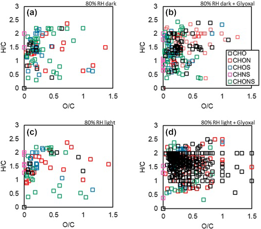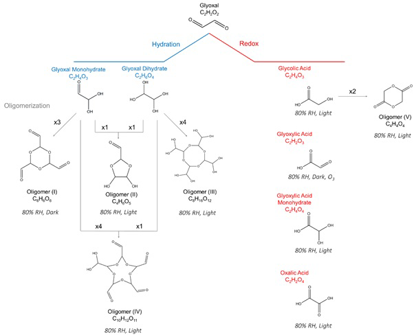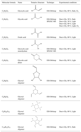 2. Electrospray ionization (ESI) high-resolution mass spectrometry (Kourtchev et al., 2015) was used to obtain high-resolution mass spectra and formulae assignments for low-volatility compounds in the ranges m/z 50–500 and m/z 150–1000 (Zielinski et al., 2018). These were processed to provide parameters describing the carbon oxidation, through O/C and H/C bulk ratios, and the identification of molecular groups such as CHO, CHON, CHOS, CHNS, and CHONS. ESI-HR-MS was also used for a screening analysis of molecules resulting from the glyoxal transformation due to hydration, oxidation, and oligomerization. These included formulas for mono- and dihydration products (C2H4O3 and C2H6O4, respectively), oxidation products (formic acid (CH2O2), glycolic acid (C2H4O3), glyoxylic acid (C2H2O3), and oxalic acid (C2H2O2)), and oligomers formed by the hydrolysis of hydrated glyoxal formulas (linear oligomers with generic stoichiometric formula C2n+2mH4n+6m-2(n+m-1)O3n+4m-(n+m-1), and ring oligomers with generic formulae C2n+2mH4n+6m-2(n+m)O3n+4m-(n+m)).