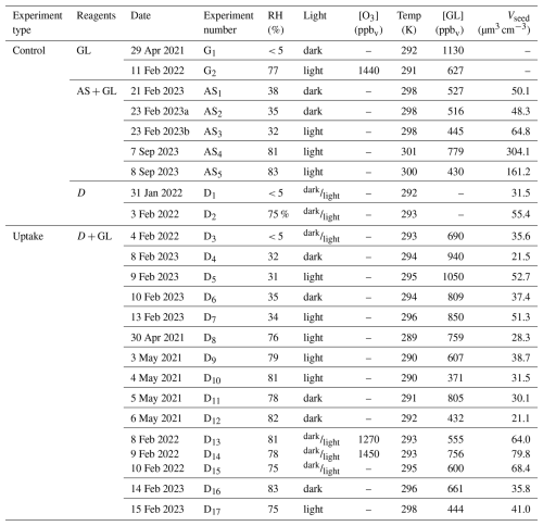 Table 1Listing and initial conditions of the experiments considered in this study, including experiments with glyoxal only (experiment type GL), ammonium sulphate and glyoxal (AS + GL), dust only (D) and dust with glyoxal (D+GL). The glyoxal and ozone gas phase concentrations correspond to the maximum value measured by FTIR after the respective injections. Vseed indicates the maximum volume concentrations of seed particles (either dust or ammonium sulphate) measured after the particle injection. The notation “dark/light” indicates experiments when filter samples were collected both in the dark and with irradiation.