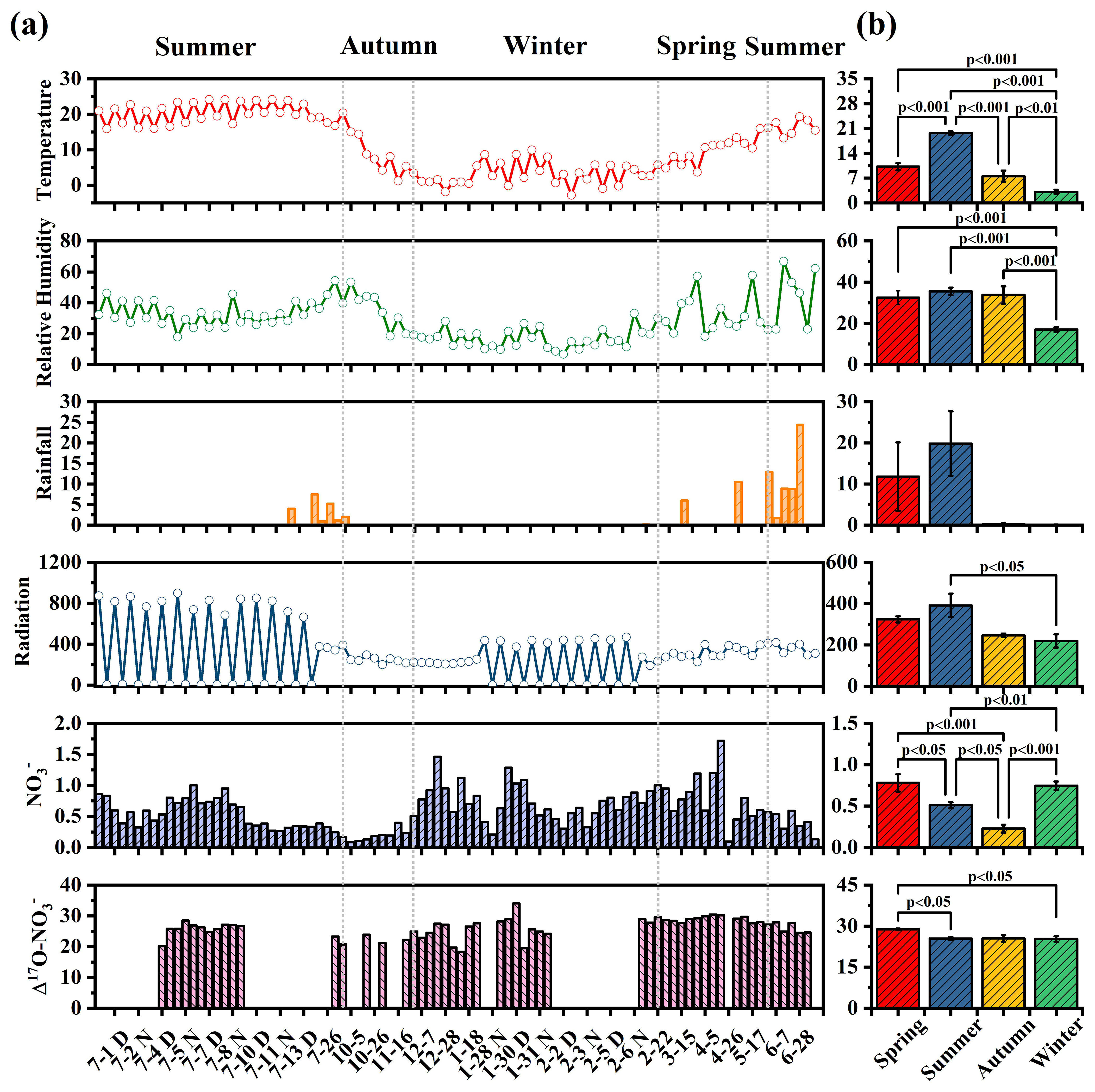 Figure 2(a) shows the time series of temperature (°C), relative humidity (%), rainfall (mm), radiation (W m−2), concentration (µg m−3), and (‰) from June 2022 to July 2023. (b) shows the average values at different seasons with their statistical significance.