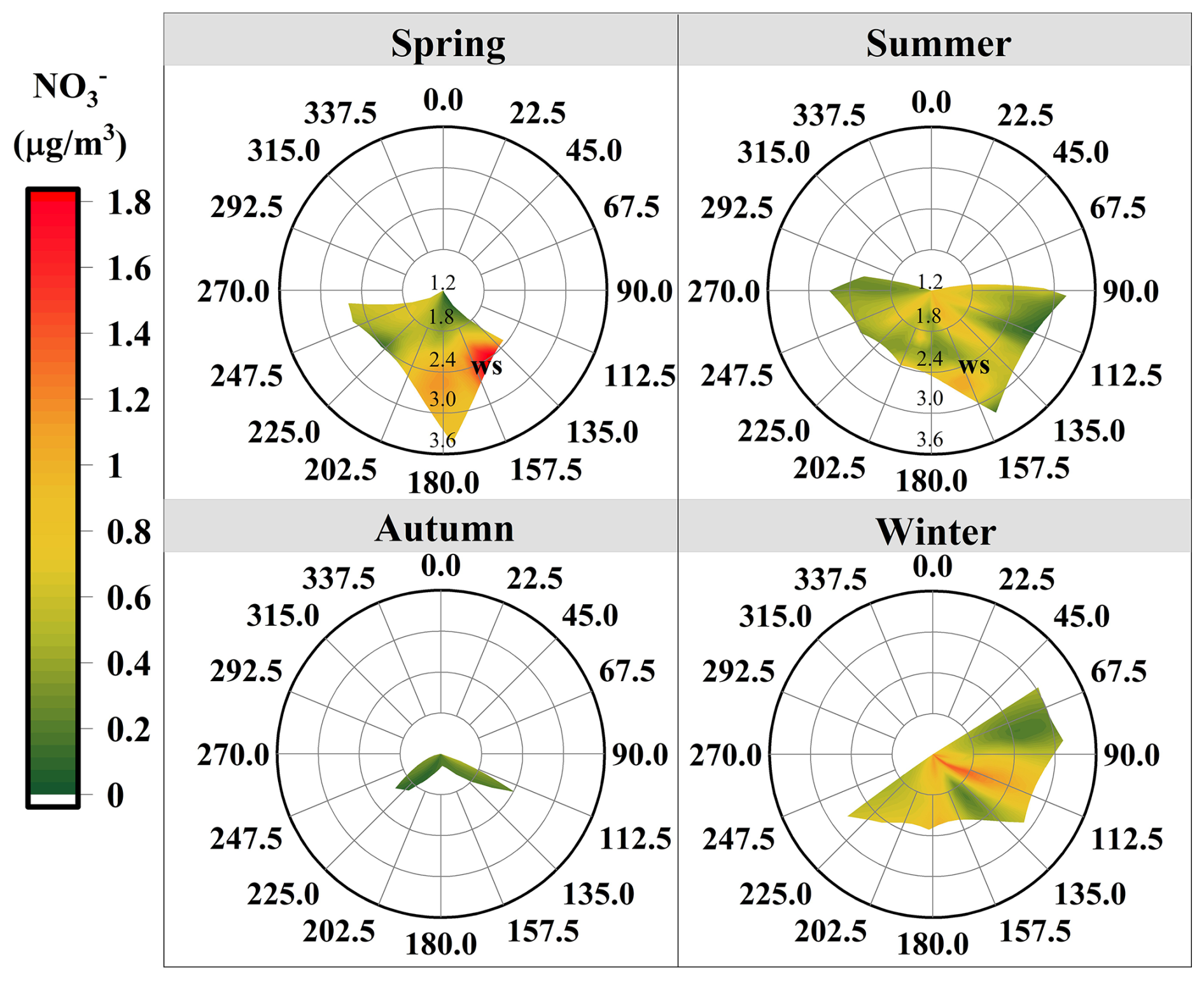 In spring, high concentrations were associated with weak southeasterly winds () in the bivariate polar plot, suggesting probable impacts from local emissions (Fig. 3). The southeasterly sector of the sampling site includes residential areas, agricultural land, and major transportation routes, which are potential NOx sources. In spring, intensified agricultural activities (e.g., fertilization, biomass burning) might increase NOx emissions. Meanwhile, low wind speeds likely limit atmospheric dispersion, promoting the local accumulation of precursors and enhancing production. During the rainy summer, shorter lifetimes indicated a weak influence from regional transport, with a more pronounced contribution from local emissions. In autumn, concentrations were relatively low, which coincided with strict local COVID-19 restrictions in Lhasa. These measures significantly reduced human activity and traffic, leading to suppressed local emissions. Despite low wind speeds typically favoring pollutant accumulation, concentrations remained low, suggesting that both reduced local sources and seasonal meteorological conditions constrained production. Nevertheless, the persistence of measurable under such stagnant conditions also implied a potential contribution from regional transport during this period. In winter, elevated concentrations under low wind speeds () emphasized the significant contribution of local emissions. These findings underscored that both regional transport and local emissions were important contributors to concentrations in Lhasa. Furthermore, based on our day-night sampling scheme, no nychthemeral (day–night) differences in concentrations were detected (Table S1 in the Supplement). A similar day-night pattern of concentrations has also been observed in Beijing (Luo et al., 2020).