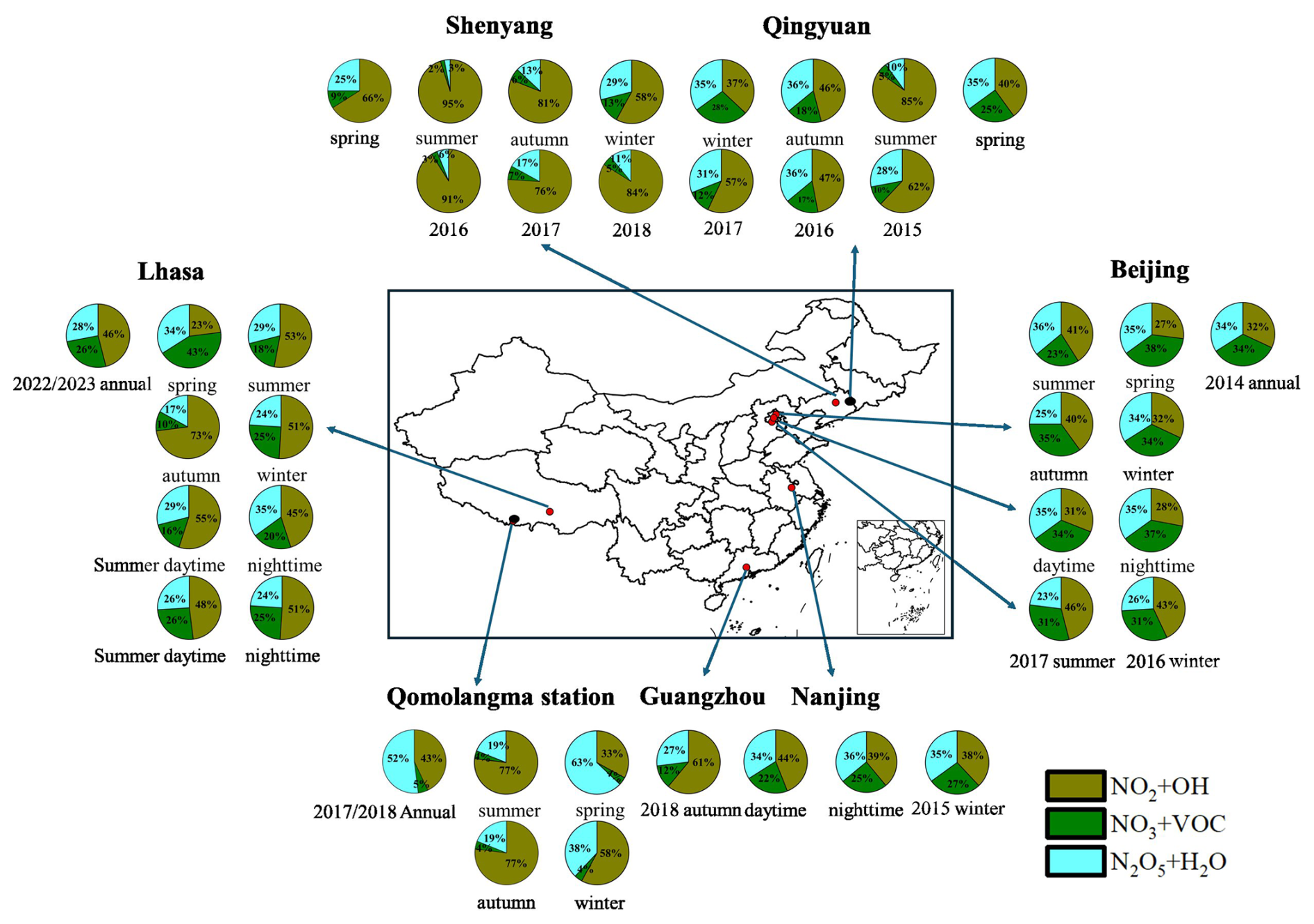 Figure 4Summary of the relative contributions of key oxidation pathways using the Δ17O methodology across China (data given in Table S4). Colors for the study labels indicate the type of sampling location: urban areas (red) and rural/remote areas (black). The pie charts show the relative contribution of different pathways to formation: ( deep yellow), (deep green), and (light blue).