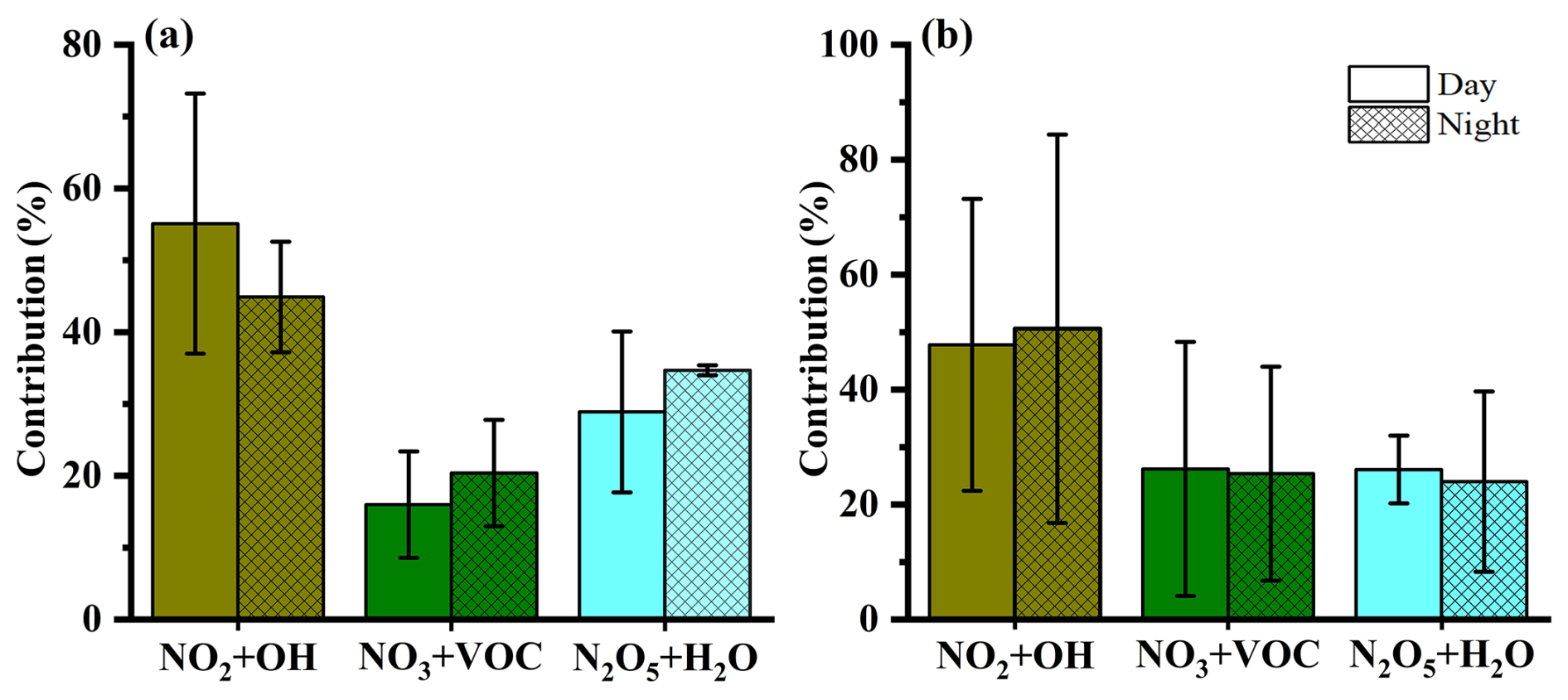 Figure 5The relative contributions (mean ± SD values) of NO2+OH, NO3+VOC, and N2O5+H2O to formation during the day and night in (a) summer and (b) winter in Lhasa during the sampling campaign.