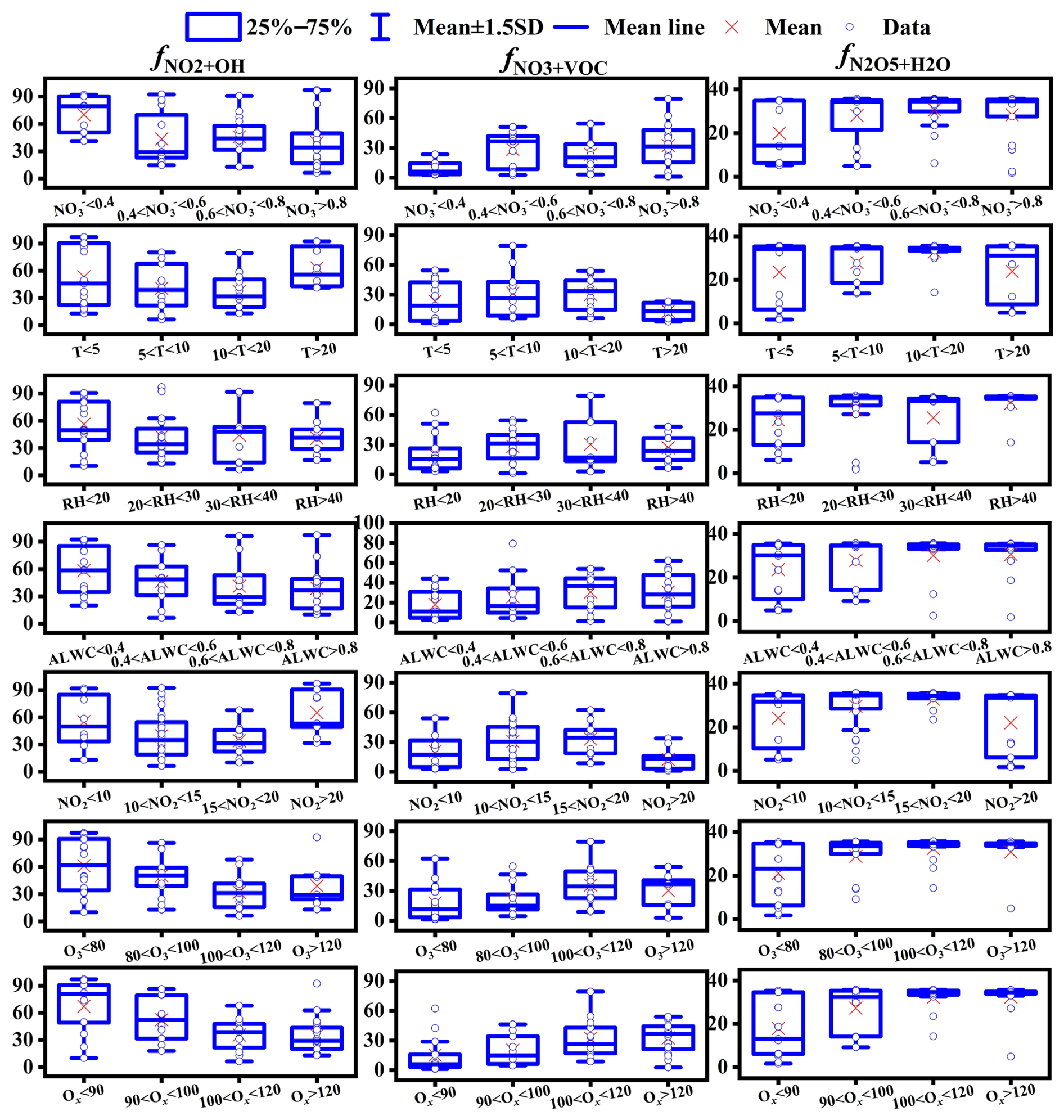 As shown in Fig. S8, the NO3+VOC pathway emerged as the major contributor to formation during periods of high spikes. To elucidate the formation pathways under different concentrations, samples were categorized into different concentration ranges (Fig. 6). We found that the values increased and values decreased with the concentrations increasing. Although recent field radical measurements in urban sites in China found that OH and HO2 radicals during haze periods were comparable to those on clean days (Slater et al., 2020; Yang et al., 2021), our results suggested that the NO3+VOC pathway still played an important role in production under high concentrations in Lhasa, possibly due to enhanced VOC emissions. In addition to concentration effects, meteorological factors typically also regulate the oxidation pathways. Typically, high T promotes the formation via values (Han et al., 2015). However, our study revealed that the relationship between T and values did not consistently show a positive trend. Further analysis indicated that NO2 and O3 concentrations were negatively correlated, with lower NO2 concentrations paired with elevated O3 levels (Fig. S9). values reached their minimum when NO2 was between 15 and 20 µg m−3 and O3 was within 100–120 µg m−3. Although OH radicals exhibit a higher oxidation potential (2.8 V) than O3 (2.07 V), their atmospheric availability is much lower than that of O3 (Carslaw et al., 1999; Dubey et al., 1997). Therefore, NO2 at lower concentrations is more likely to be oxidized by OH than by O3, even though O3 concentrations were high. With increasing NO2 concentrations, the availability of OH radicals for oxidizing NO2 became lower, resulting in a relatively higher proportion of NO2 being oxidized by O3 although O3 concentrations were low. However, when the concentration of O3 was below 20 µg m−3, O3 concentrations were not sufficient to oxidize NO2 due to the higher NO2 concentrations and OH radicals for oxidizing NO2 would redominate. These observations underscore that in high-altitude urban environments like Lhasa, OH effectiveness is more important for oxidation pathways than that of O3. Additionally, we identified an intriguing positive correlation between the atmospheric oxidizing capacity () and values. values were lowest when Ox was less than 90 µg m−3, corresponding to a maximum contribution from the NO2+OH pathway. This suggests that Ox is more indicative of the pathways of formation in the atmosphere compared to either NO2 or O3 alone. Typically, high RH and ALWC were also positively correlated with . However, RH was associated with variable contributions from the N2O5+H2O pathway in our study, while increasing ALWC significantly enhanced this pathway, indicating ALWC as a more reliable indicator of formation.