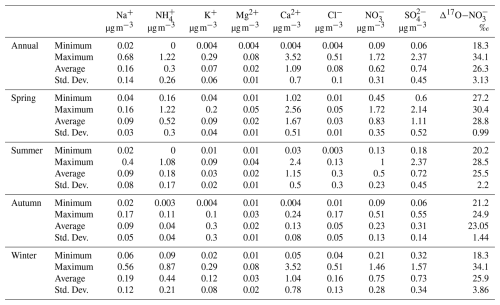 mass concentrations ranged from 0.10 to 1.72 µg m−3, with an average value of . concentrations exhibited distinct seasonal patterns. As shown in Fig. S1 in the Supplement, the equivalent concentrations of [] were considerably higher than those of [], indicating that was insufficient to fully neutralize . This suggests that a portion of may have existed in other forms, such as KNO3 and Ca(NO3)2. This inference is supported by the strong positive correlations between and K+ (r=0.64, p<0.1) and Ca2+ (r=0.43, p<0.01), especially in spring, as shown in Fig. S2. In contrast, showed relatively weak negative correlations with T (, p<0.01) and RH (, p<0.1), indicating that under the specific atmospheric conditions in Lhasa, meteorological parameters might not be the dominant factors controlling the gas-particle partitioning of . The maximum monthly average values of concentration occurred in spring () with the instantaneous maximum reaching 1.72 µg m−3, whereas the lowest was recorded in autumn () with an instantaneous minimum of only 0.09 µg m−3 (Table 1). The elevated concentrations in spring could be attributed to biomass burning from South and Southeast Asia (Figs. S3 and S4). The strong correlation between and K+ in spring further supports this explanation.