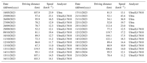 Table A1Date, travel distance, speed, and the type of the gas analyzer used in the campaign for the vehicle measurements.