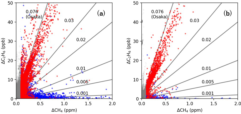 Figure 3Relationships between CH4 and C2H6 enhancements based on vehicle measurements (a) and bicycle measurements (b). The red dots represent the data for which the correlation coefficient between these two gases was greater than 0.7, and the blue dots represent the data for which the correlation coefficient was lower. Gray dots represent data that were not classified as leak indications because of the CH4 enhancements smaller than the criteria (0.1 ppm). The lines represent various slopes, and 0.076 ppm ppm−1 represents the C2 : C1 ratio for natural gas provided by the local gas company in the Osaka metropolitan area.