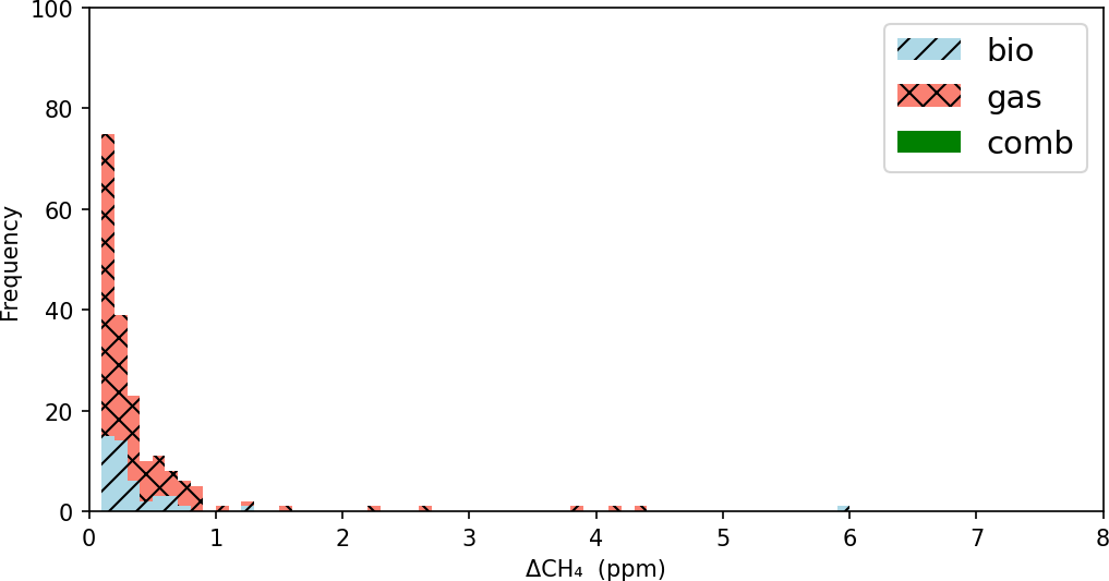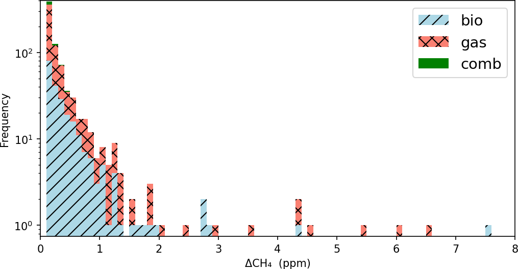 Figure 4Histogram of CH4 enhancements (ΔCH4) based on vehicle measurements for Osaka and Sakai. Note that the y-axis is shown as a log scale. The values 1 to 8 in the horizontal axis for ΔCH4 correspond to emission rates of 3.4, 7.8, 12.9, 18.3, 24.0, 30.0, and 36.3 L min−1, respectively.