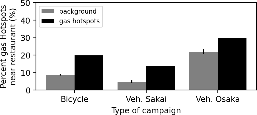 The probability of a restaurant existing near identified natural gas LIs was significantly greater than that near a location where no natural gas LI was observed (hereafter referred to as the baseline probability) (Fig. 7). For Sakai city, the probability of a restaurant being included in the vehicle measurements was 14 %, and the probability of a restaurant being included in the bicycle measurements was 20 %, which was significantly greater than the baseline probability (4.7 % ± 0.8 % for the vehicle measurements and 8.8 ± 0.4 % for the bicycle measurements; plus/minus sign denotes standard error of bootstrapping). The probability of a restaurant existing near natural gas LIs was 30 % for Osaka city, which was higher than that for Sakai city. The baseline probability for Osaka city (22 % ± 1.4 %) was also higher than that for Sakai city because Osaka city is a highly urbanized city where there are many restaurants. On the basis of Bayesian theory, the probabilities of existing restaurants emitting natural gas-related CH4 were 2.4 % for Osaka city, 2.5 % for Sakai city according to vehicle measurements, and 2.7 % for Sakai city according to bicycle measurements. This finding either suggests that 2 %–3 % of restaurants have detectable gas leaks or that if all restaurants emit CH4, they only emit detectable levels (detectable at the roadside) 2 %–3 % of the time.
