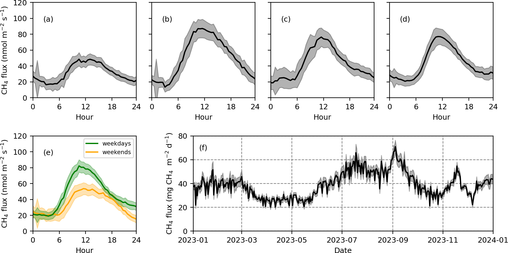 Figure 8CH4 fluxes measured via the eddy covariance method in 2023. Mean diurnal variation in CH4 fluxes from March to May (a), from June to August (b), from September to November (c), from December to February (d), and for the whole year for weekdays and weekends (e). The shading in panels (a)–(e) indicates the standard error of the measured CH4 fluxes at each time point. The daily CH4 flux for 2023, where the shading represents the standard error based on 100 bootstrap samples in gap filling (f).