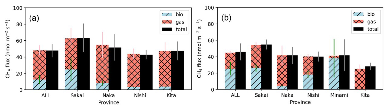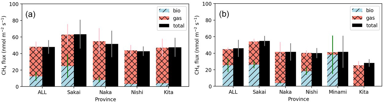 The aggregate emissions estimate from the mobile measurements is representative of different emission processes (street-level emissions) to the total flux footprint from eddy covariance. Therefore, we do not expect the resulting emission totals to be directly comparable since it is likely the mobile measurements may miss emissions occurring above street level, as well as any smaller more disperse sources that do not result in a detectable sharp peak in the CH4 concentration. However, the mobile measurements provide a much greater coverage of the city than the EC flux. As such, we use the mobile measurement estimates, adjusted by the derived scale factor, A, as a proxy to estimate CH4 emissions across Sakai and Osaka cities, including the attribution to biogenic and natural gas sources. We estimated the upscaled CH4 fluxes using Eq. (6) with different values of Em derived from Eqs. (5), (7), (8), and (9) and considered the range of upscaled fluxes as an uncertainty.