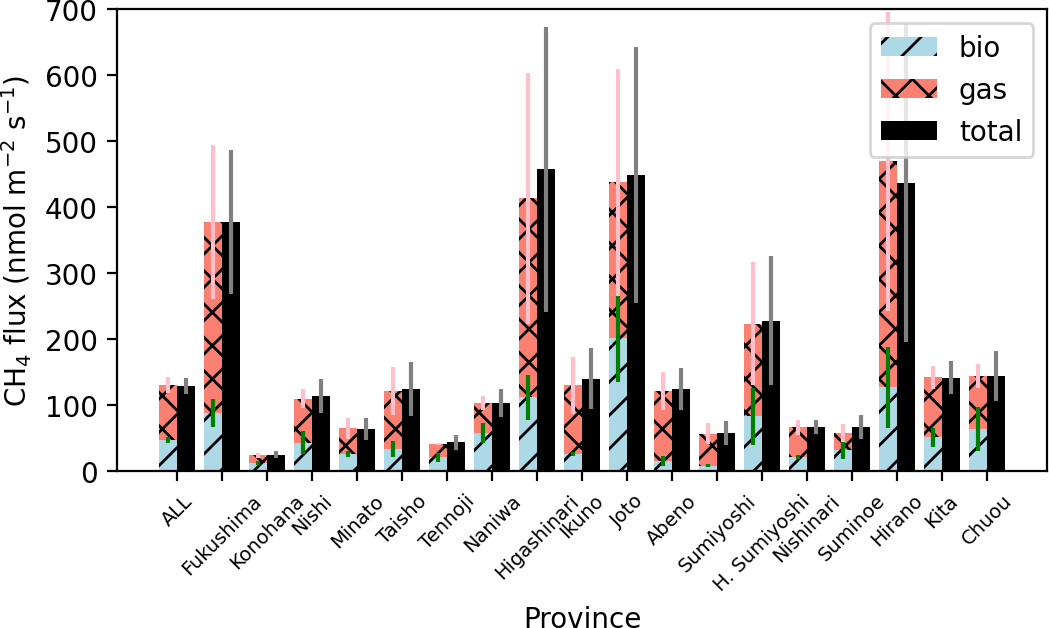 CH4 fluxes were estimated for the administrative divisions of Sakai city to compare the fluxes determined from the bicycle and vehicle measurements. As noted above, the estimated CH4 fluxes were scaled to ensure that the upscaled CH4 fluxes for Sakai Ward from the bicycle measurements were consistent with the long-term mean daytime CH4 fluxes measured via the EC method (approximately 65 nmol m−2 s−1) (Sects. 3–4). There was no clear difference in CH4 flux between estimates based on the sum of biogenic and natural gas fluxes and direct estimates without considering the source types (Fig. 10).