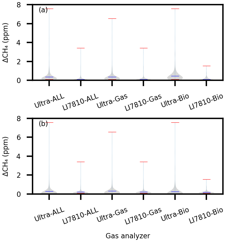 Figure A2Violin plots for ΔCH4 enhancements (ΔCH4) measured at LIs based on the vehicle measurements by the Mira Ultra analyzer installed at 0.5 m above the ground and the LI-7810 analyzer at 1.85 m. Panel (a) is ΔCH4 identified by the Ultra analyzer, and panel (b) is ΔCH4 identified by the LI-7810 analyzer. The plots are summarized for natural gas and biogenic sources as well as for all LIs. The source attributions are based on C2 : C1 for the Ultra analyzer and ΔCH4 for the LI-7810 analyzer.