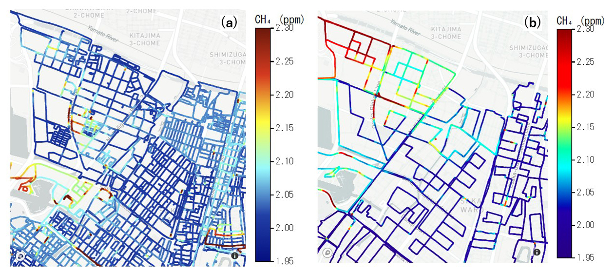 LIs per travel distance were 2 times greater in Osaka city (495 LIs; 0.39 km−1) than in Sakai city (235 LIs; 0.22 km−1). In terms of emission sources, both biogenic and natural gas LIs were higher in Osaka city (0.13 km−1 for biogenic gas and 0.24 km−1 for natural gas) than in Sakai city (0.05 km−1 for biogenic gas and 0.15 km−1 for natural gas). These results indicate that Osaka city, which is more urbanized than Sakai city, has more natural gas and biogenic CH4 emission points.