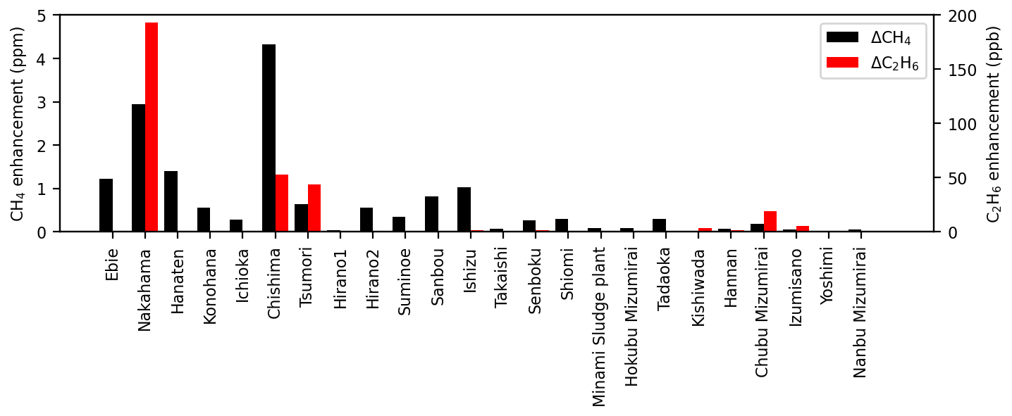 CH4 enhancements near sewage treatment plants were not too high, i.e., up to 4.3 ppm (Fig. A4). Although the C2 : C1 ratio revealed that most of the CH4 enhancements were biogenic (n = 11), four plants with high C2 : C1 ratios (Chisima, Nakahama, Tsumori, and Chubu Mizumirai) were classified as having natural gas emissions.