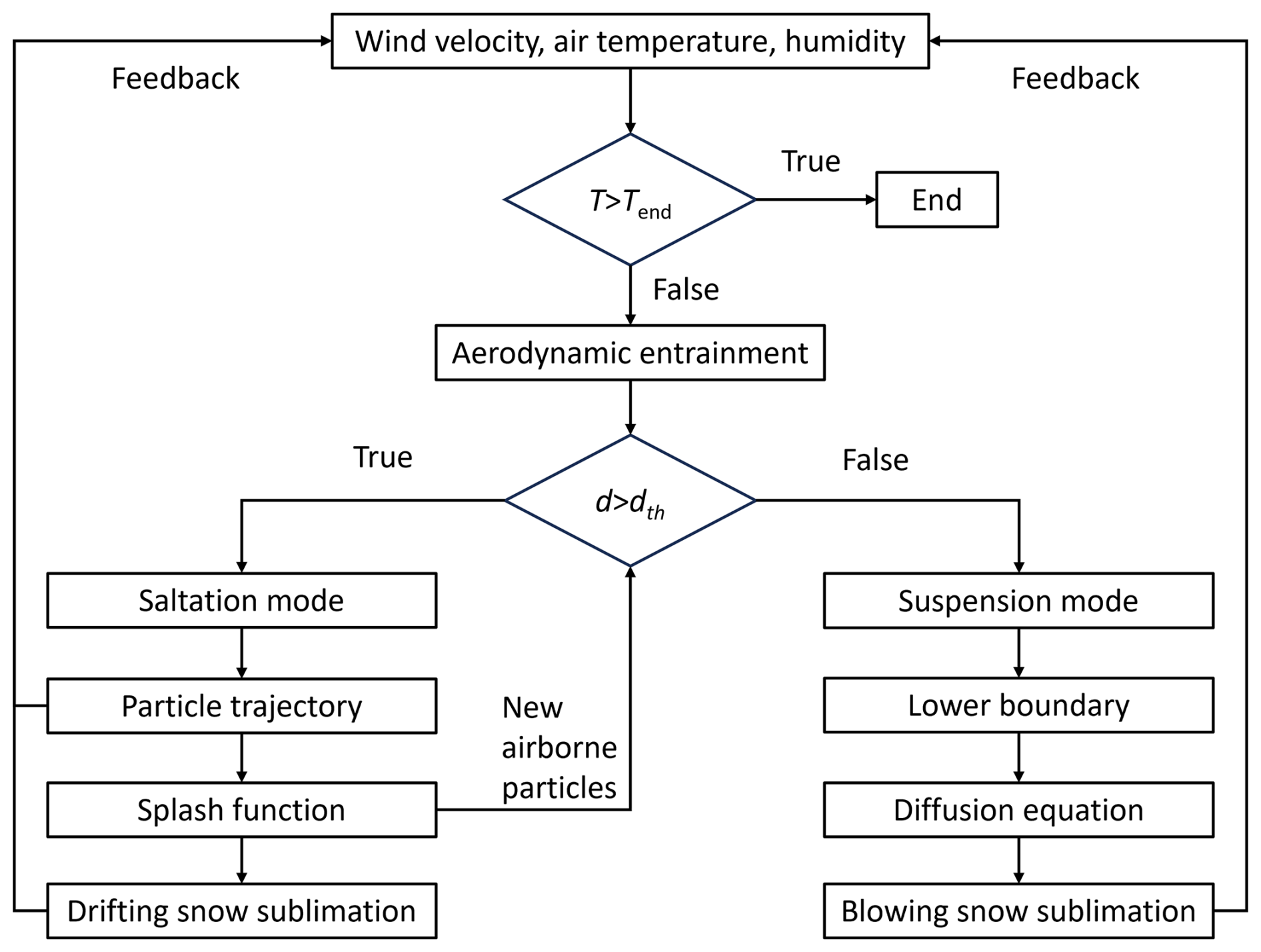 The motion of saltating snow particles can be described as five sub-processes, namely aerodynamic entrainment, particle trajectory, splash function, sublimation, and feedback to air.