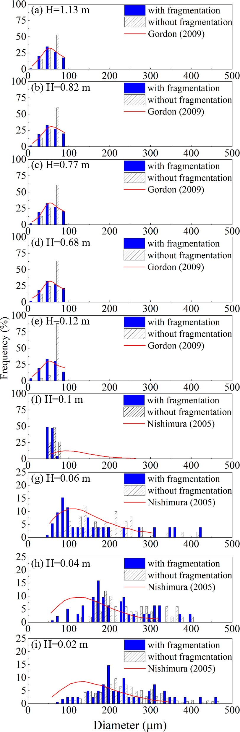 Figure 2Particle size distributions at nine different heights above the surface: 1.13, 0.82, 0.77, 0.69, 0.12, 0.10, 0.06, 0.04, and 0.02 m. Blue bars represent simulation results with fragmentation considered, and gray bars denote results without fragmentation. The red solid line represents field measurements. For heights below 0.1 m, simulated results are compared with observations from Nishimura and Nemoto (2005) at Mizuho Station, Antarctica; for heights above 0.1 m, comparisons are made with data from Gordon and Taylor (2009) in Manitoba, Canada.