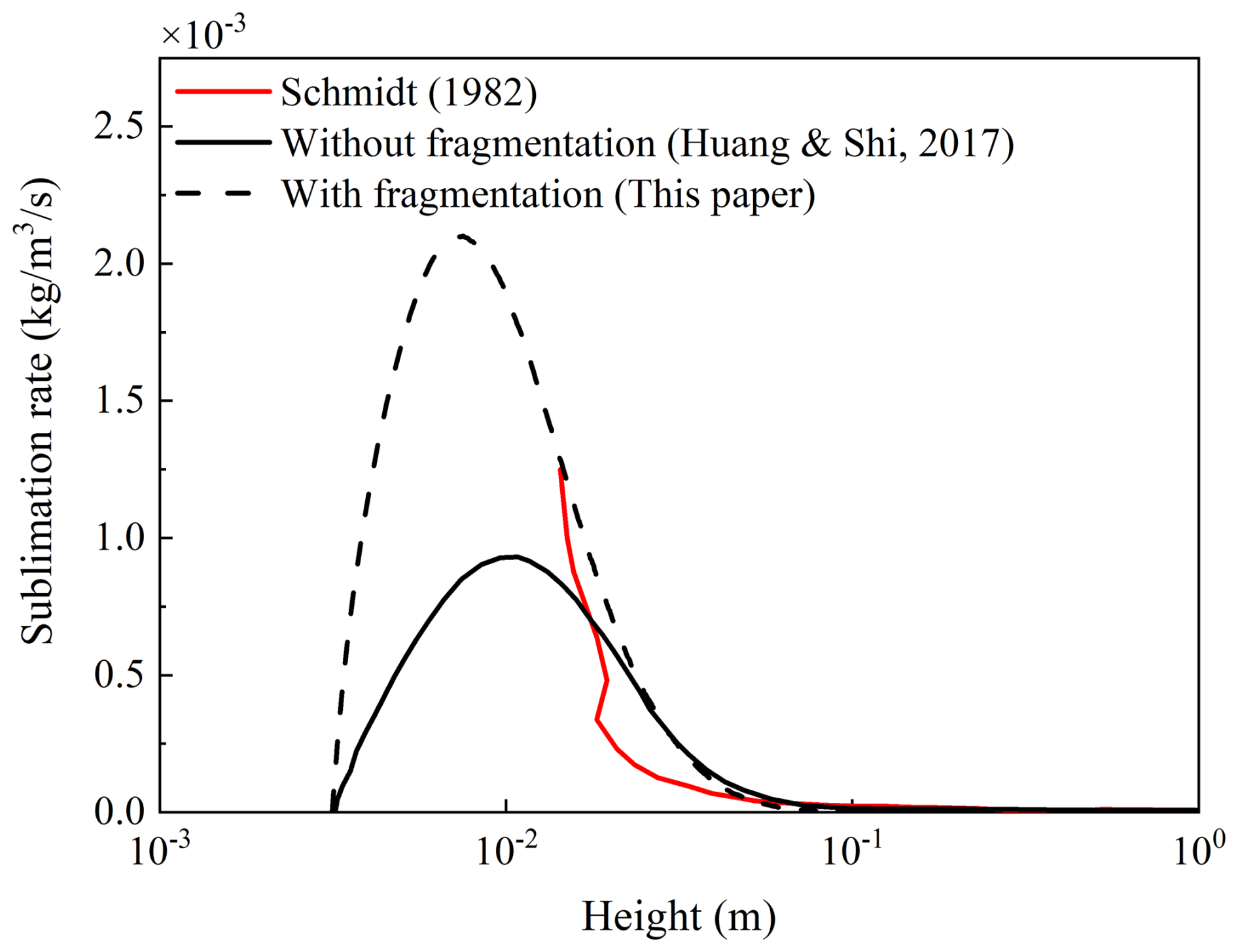 Here we defined the total sublimation rate as the sum of the sublimation rates of both the saltation layer and the suspension layer. Figure 3 compares the total sublimation rate profiles obtained from the numerical simulation with field observation data (measured by Schmidt1982, near Wyoming, USA). The sublimation rates in both profiles are of the same order of magnitude, demonstrating that the model can reasonably predict the sublimation rate of blowing snow. While Huang and Shi (2017) show good agreement with observations at higher elevations, their results underestimated the sublimation rate near the surface. By incorporating fragmentation, the model not only performs well near the surface but also shows better agreement with the observed sublimation rates. This indicates that the modified model can more accurately capture the near-surface snow particle dynamics, especially the particle–surface interaction.