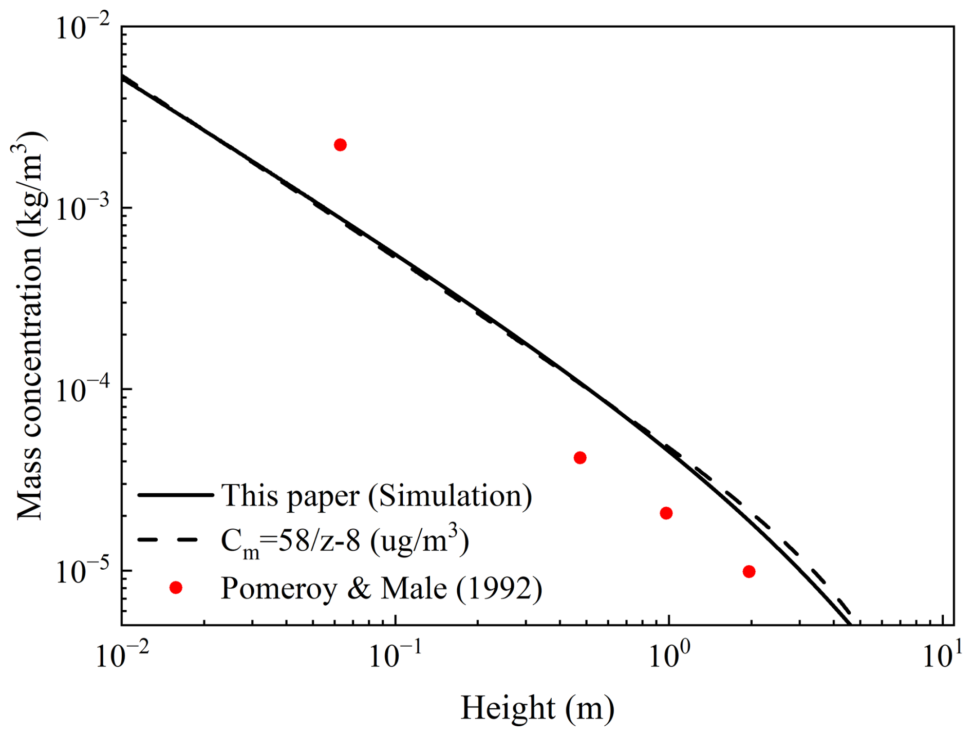 The mass concentrations from the simulation (with fitting curve) and from field observations under the same friction velocity and temperature are compared in Fig. 4. The field data were measured by Pomeroy and Male (1992) near Saskatoon, Canada. The simulated and observed values show good agreement, and the mass concentration can be described by the function cm=58/z-8 (unit: µg m−3).