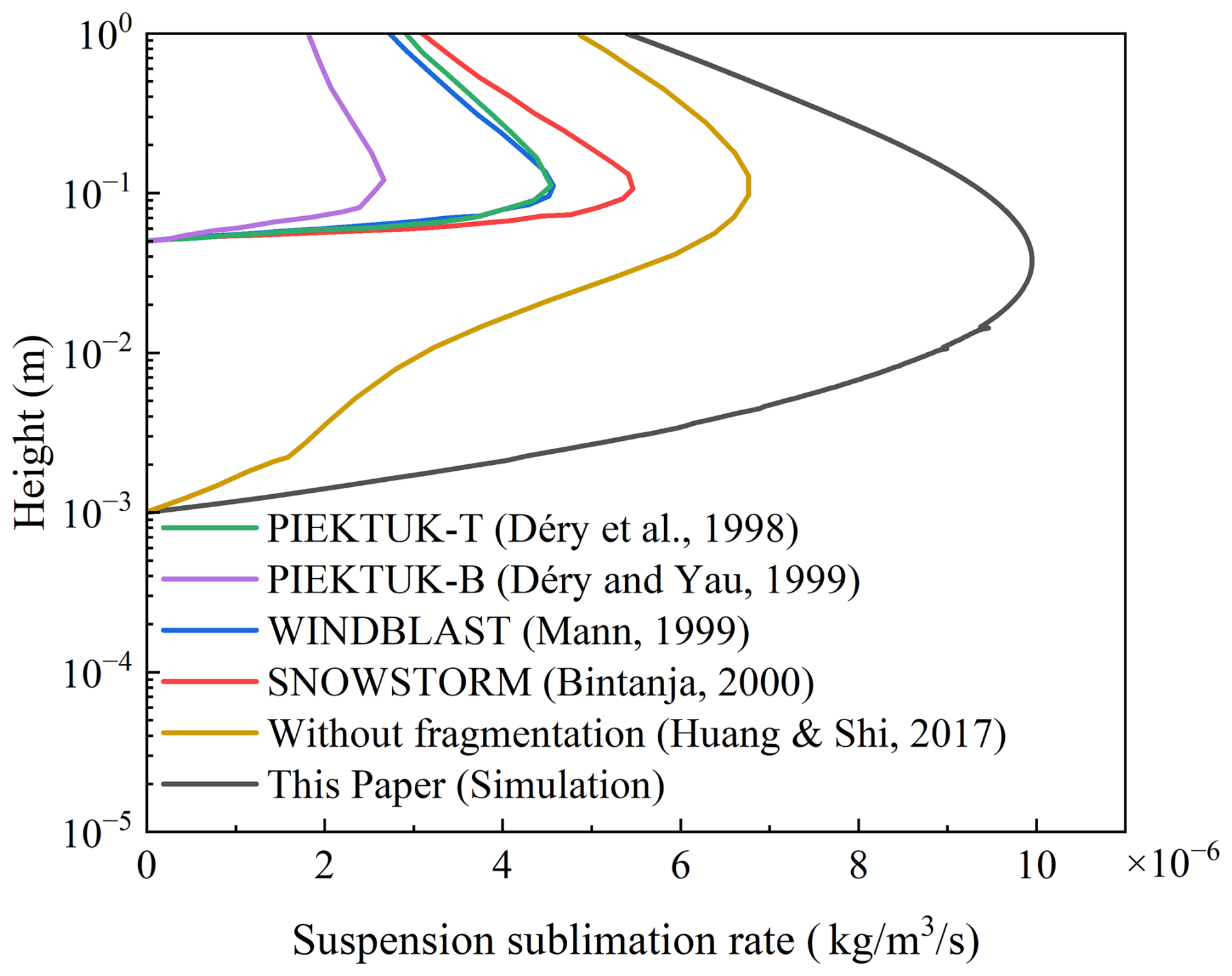 Figure 5Comparison of suspension sublimation rates predicted by different blowing snow models. The black line shows the sublimation rate of suspension when snow particle fragmentation is considered (this study), while the remaining curves represent simulation results without fragmentation from several existing models: PIEKTUK-T (Déry et al.1998), PIEKTUK-B (Déry and Yau1999), WINDBLAST (Mann1998), and SNOWSTORM (Bintanja2000), without fragmentation (Huang and Shi2017) and with fragmentation (this paper). u*=0.87m s−1, z0=0.001m, and T0=253.16K.