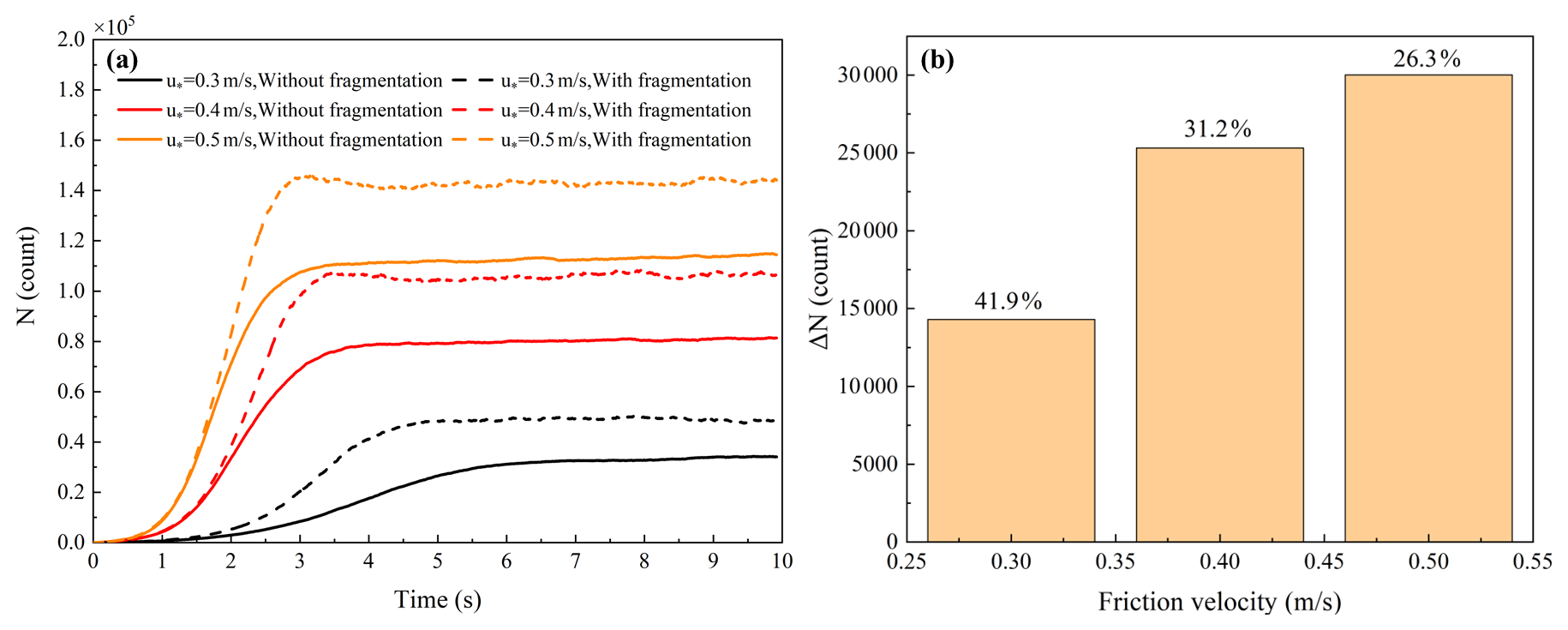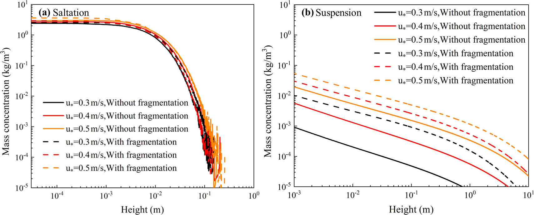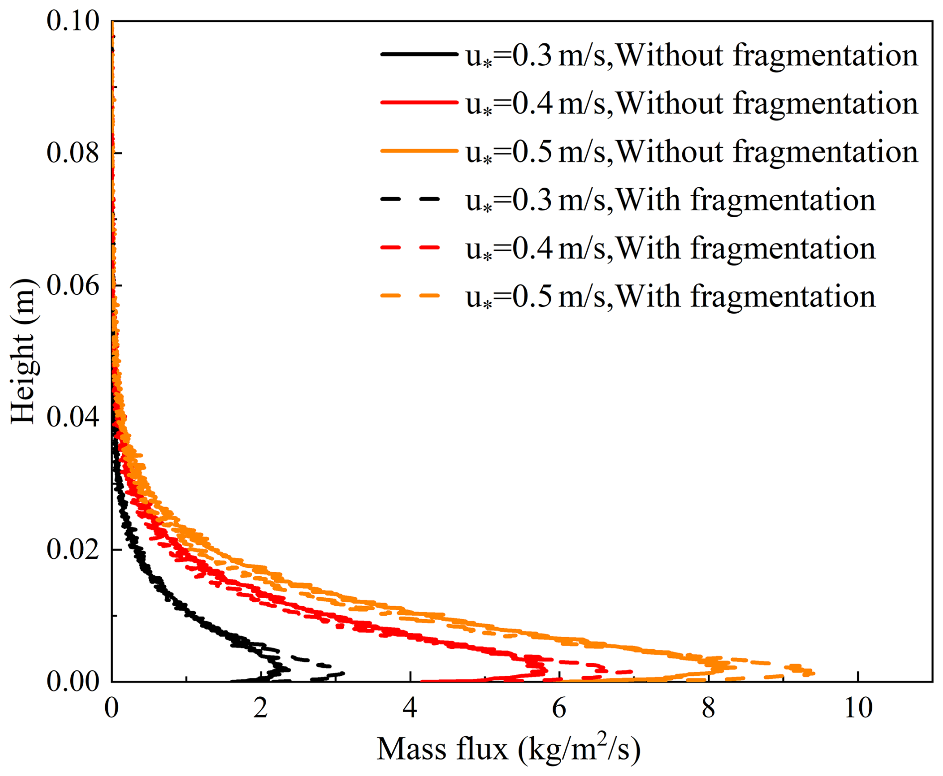 However, fragmentation has a limited impact on the overall mass flux profile, with notable changes primarily observed in the near-surface layer. Specifically, when fragmentation is considered, the mass flux below 0.01 m increases. This increase is mainly attributed to changes in the mass concentration of suspension particles, as the mass concentration of saltation particles remains largely unchanged. This indicates that fragmentation predominantly occurs within the saltation layer and primarily contributes to an increased concentration of suspended particles within this near-surface region. This is because smaller fragmented particles are more easily entrained and maintained in the airflow within the near-surface layer.