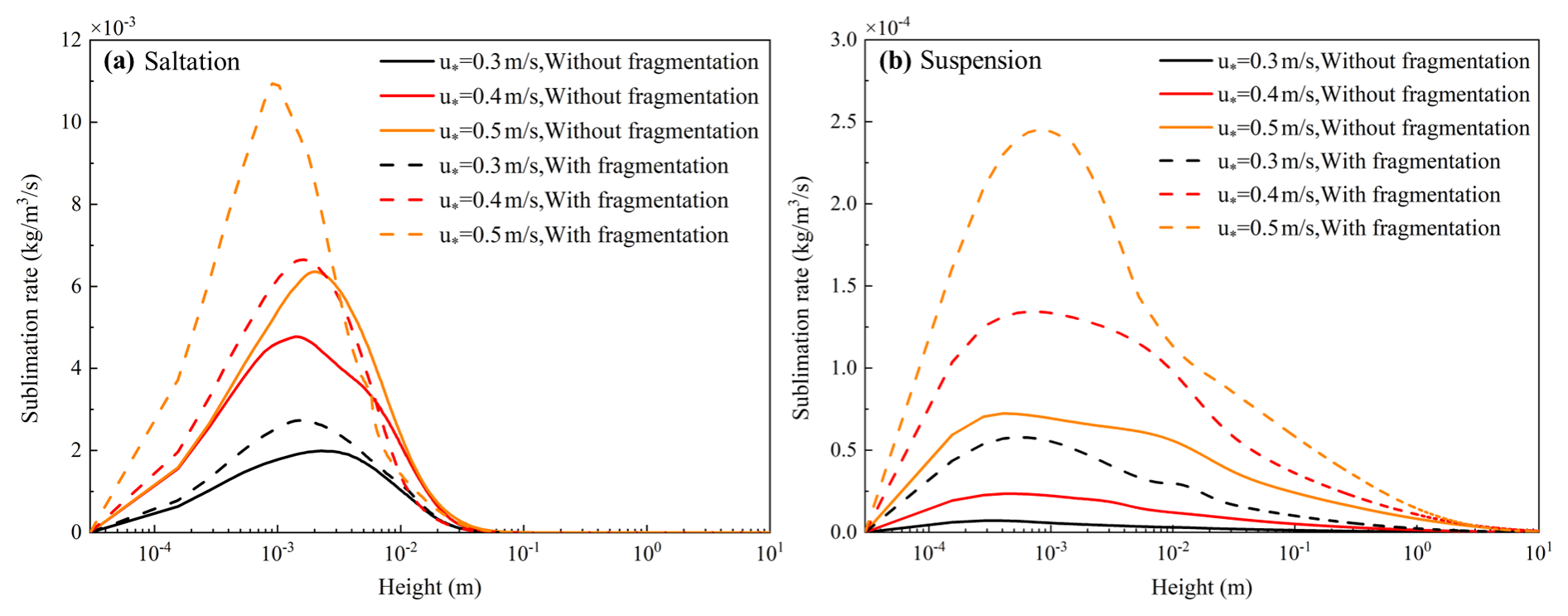 To evaluate the overall effect, we calculate the height-integrated sublimation rate of saltation particles and find that, for a friction velocity of 0.3 m s−1, the average sublimation rate of saltation particles increases by 20 % due to fragmentation, from 1.56×10-5 to 1.87×10-5kg m−2 s. However, for a friction velocity of 0.5 m s−1, this increase drops to 3 %, from 4.37×10-5 to 4.49×10-5kg m−2 s, indicating that the impact of fragmentation on the sublimation rate diminishes under stronger wind conditions. This trend can be attributed to the fact that higher friction velocities enhance particle transport and mixing, which reduces the relative contribution of fragmentation to the overall sublimation process.