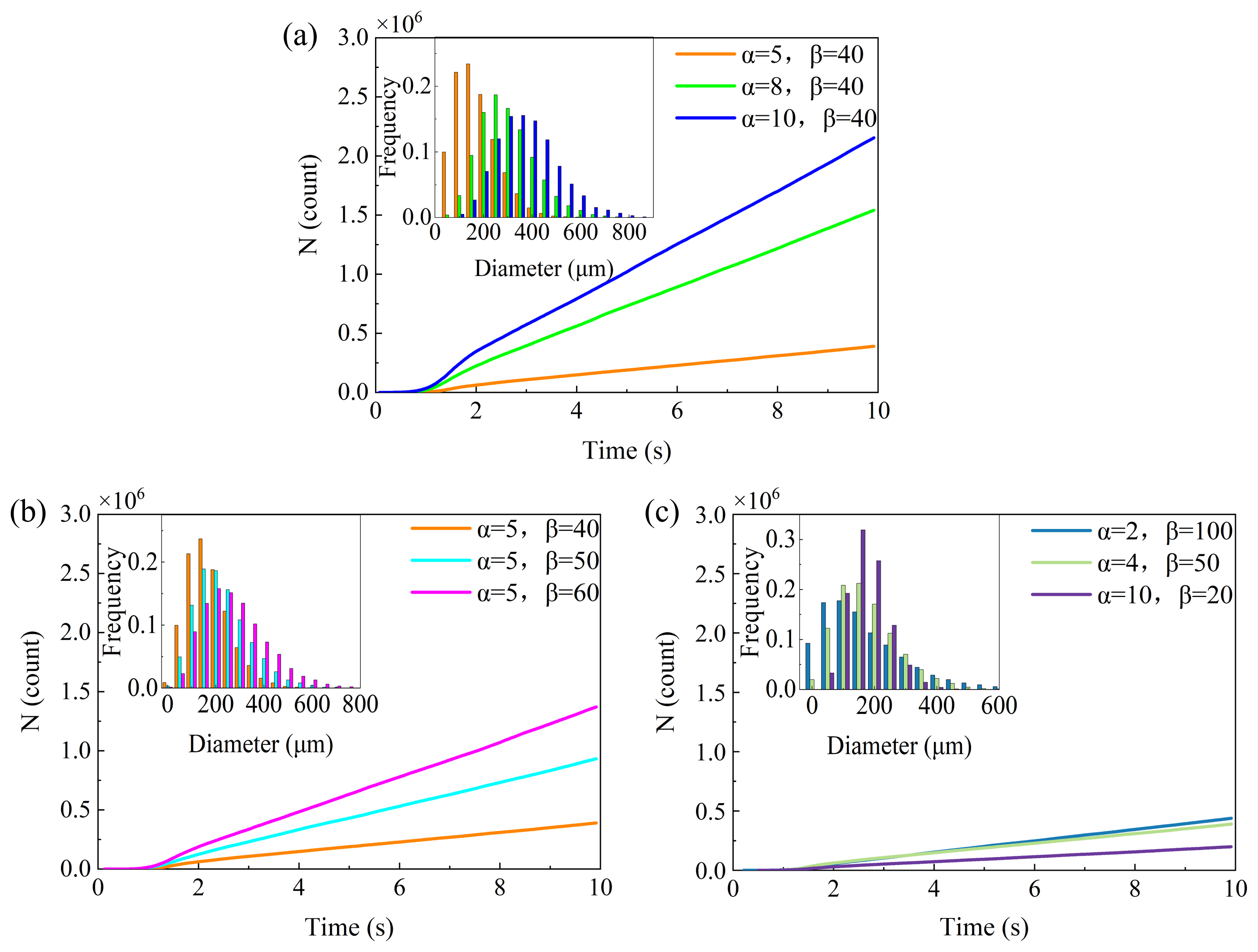 The effect of shape parameter α at a constant scale parameter β=40 is tested in cases 1–3. The variation in the number of particles N with time is shown in Fig. 11a. The results show that, as α increases from 5 to 10, the average article diameter becomes larger (as shown in the insets), leading to a significant increase in the total number of fragmentation-produced particles N over time. This indicates that distributions with a larger average particle diameter result in greater particle production through fragmentation.