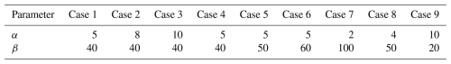 We configured cases 7–9 with the same mean diameter d¯=200µm but different α and β parameters. These differences in α and β result in particle systems with varying size distributions. In these three cases, the proportion of particles with diameter larger than the threshold diameter is 73 % (blue), 85 % (green), and 96 % (purple), respectively.