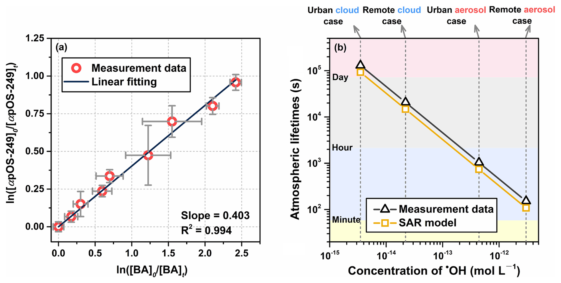 Figure 1(a) Relative kinetic plot of aqueous-phase OH oxidation of αpOS-249 in accordance with Eq. (1) using benzoic acid as the reference compound. (b) Atmospheric lifetimes of αpOS-249 against the aqueous-phase OH oxidation was calculated under various scenarios using rate constant obtained from this study (measurement data) and the SAR model. The concentrations of OH in the aqueous phase under four different scenarios were obtained from the modeling study (Herrmann et al., 2010).