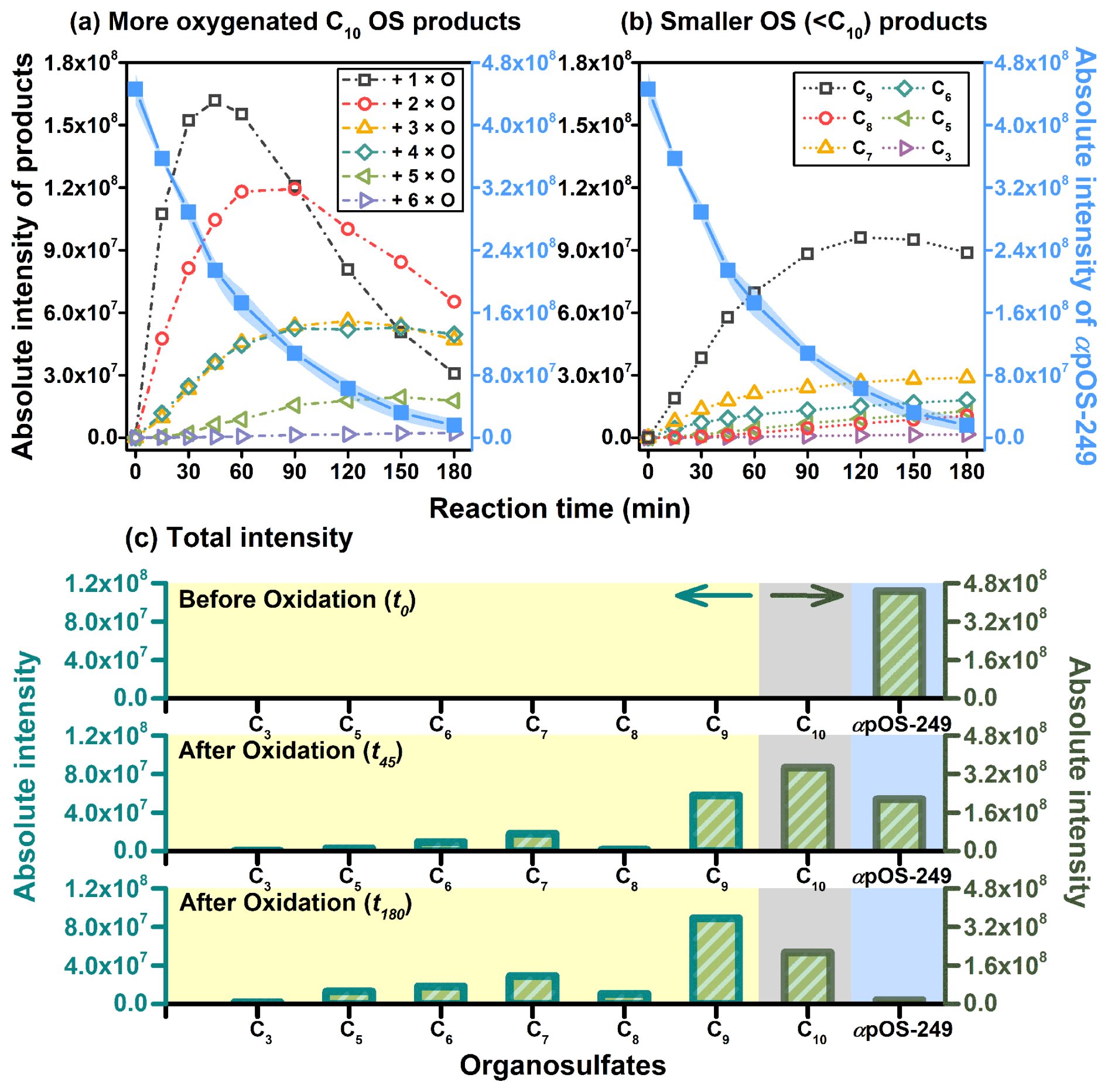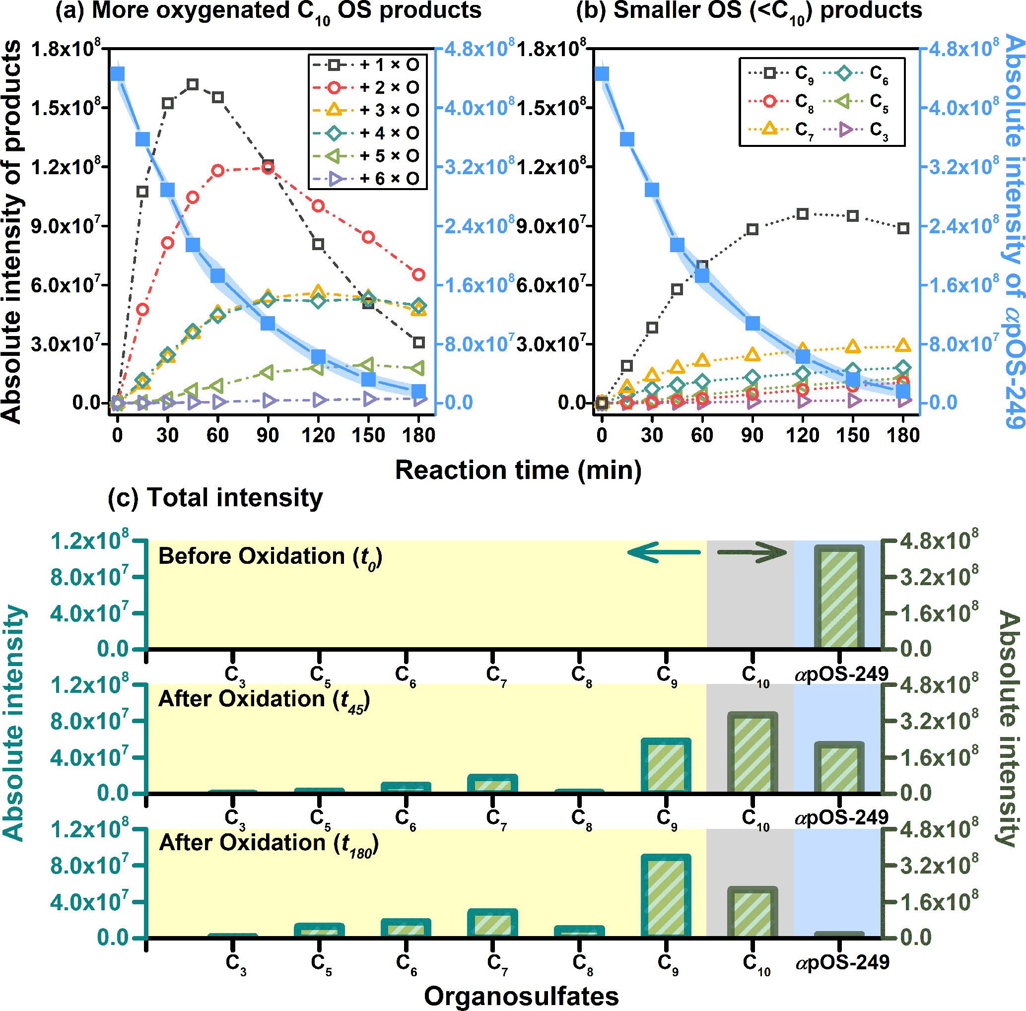 Figure 2Time-dependent evolution of absolute intensities for αpOS-249 decay and reaction products formed during the aqueous-phase OH oxidation of αpOS-249, (a) more oxygenated C10 OS products, (b) smaller OS (< C10) products, and (c) total intensity.