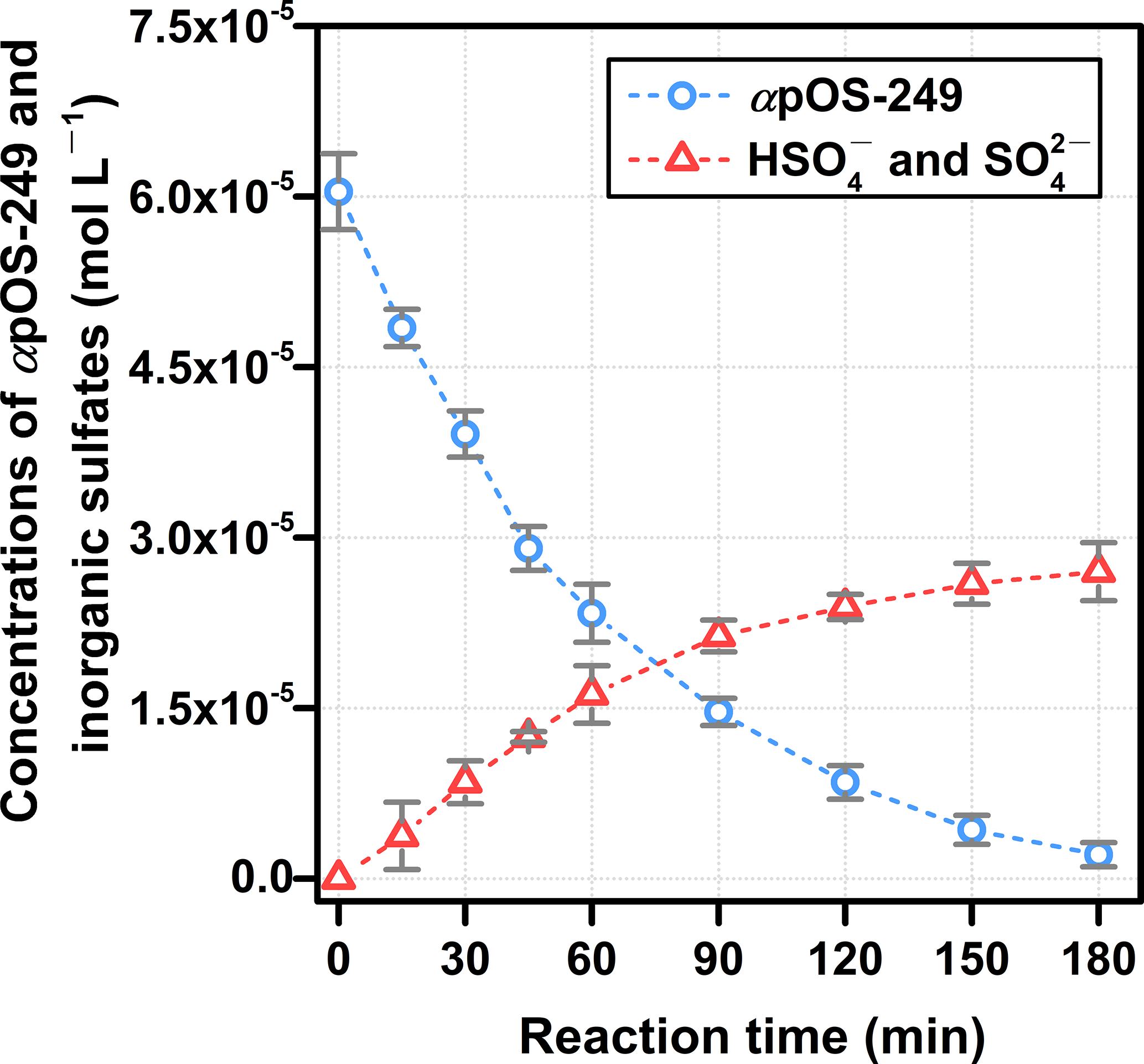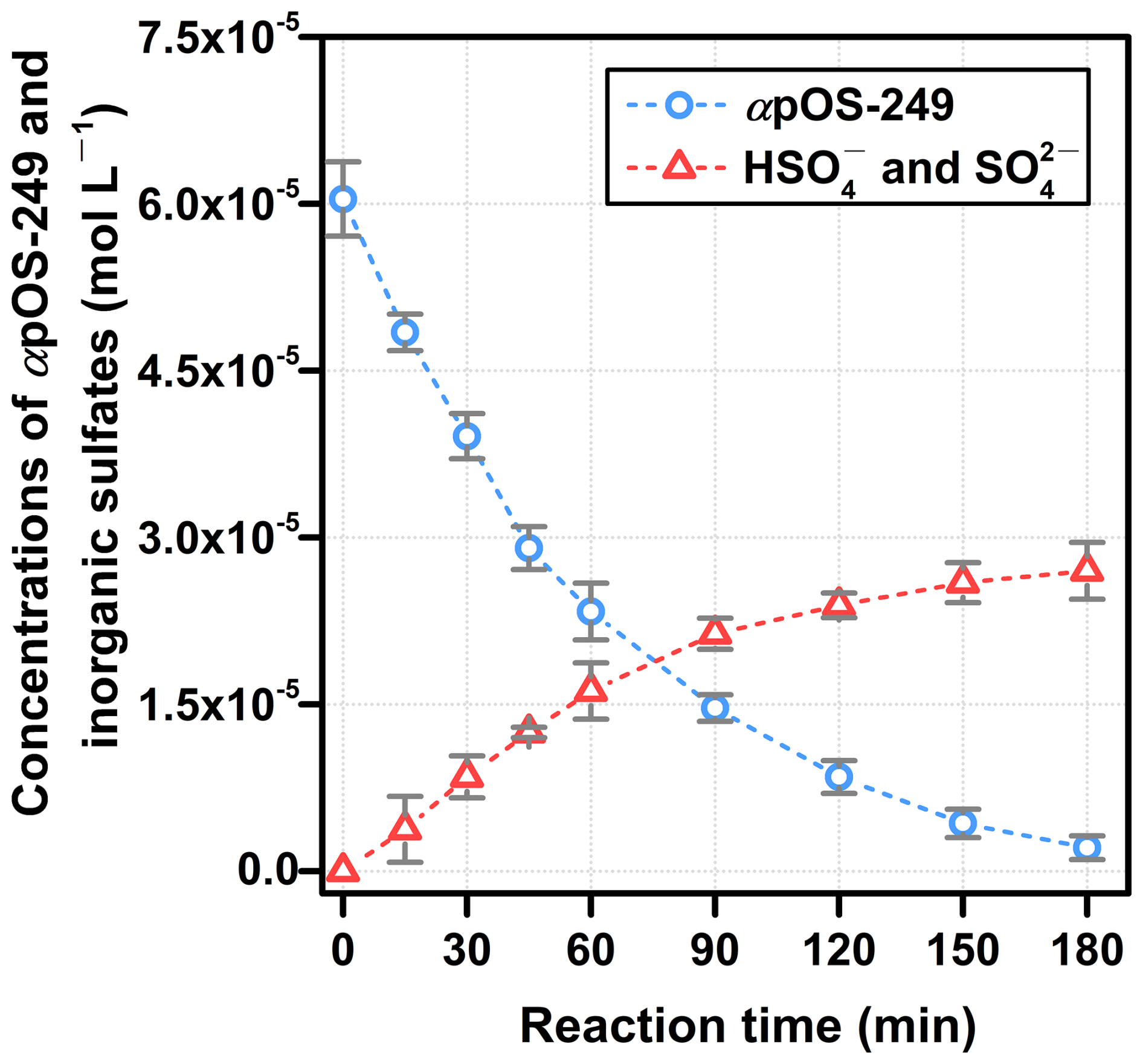 Figure 3Concentrations of αpOS-249 and inorganic sulfates (HSO4- and SO42-) as function of reaction time during the aqueous-phase OH oxidation of αpOS-249.