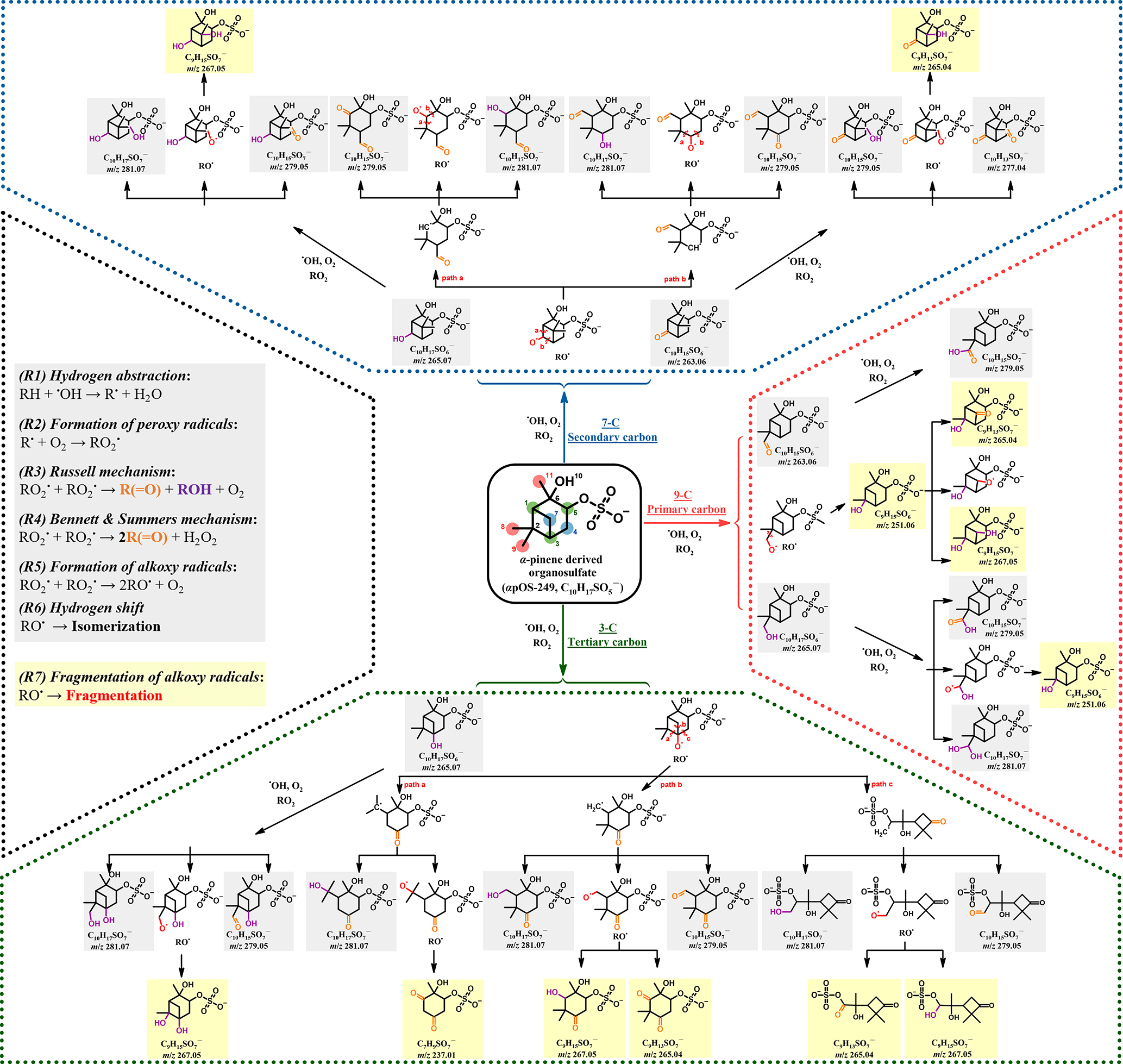 Scheme 1Proposed mechanisms for the formation of C10 OS products and smaller OS (< C10) products through functionalization and fragmentation processes during the aqueous-phase OH oxidation of αpOS-249, using 3-C, 7-C, and 9-C as representative examples with the highest predicted partial rate constants (For simplicity and clarity, we only proposed the mechanisms up to the second-generation products). Grey and yellow base colours distinguish the C10 OS products and smaller OS products, respectively.