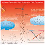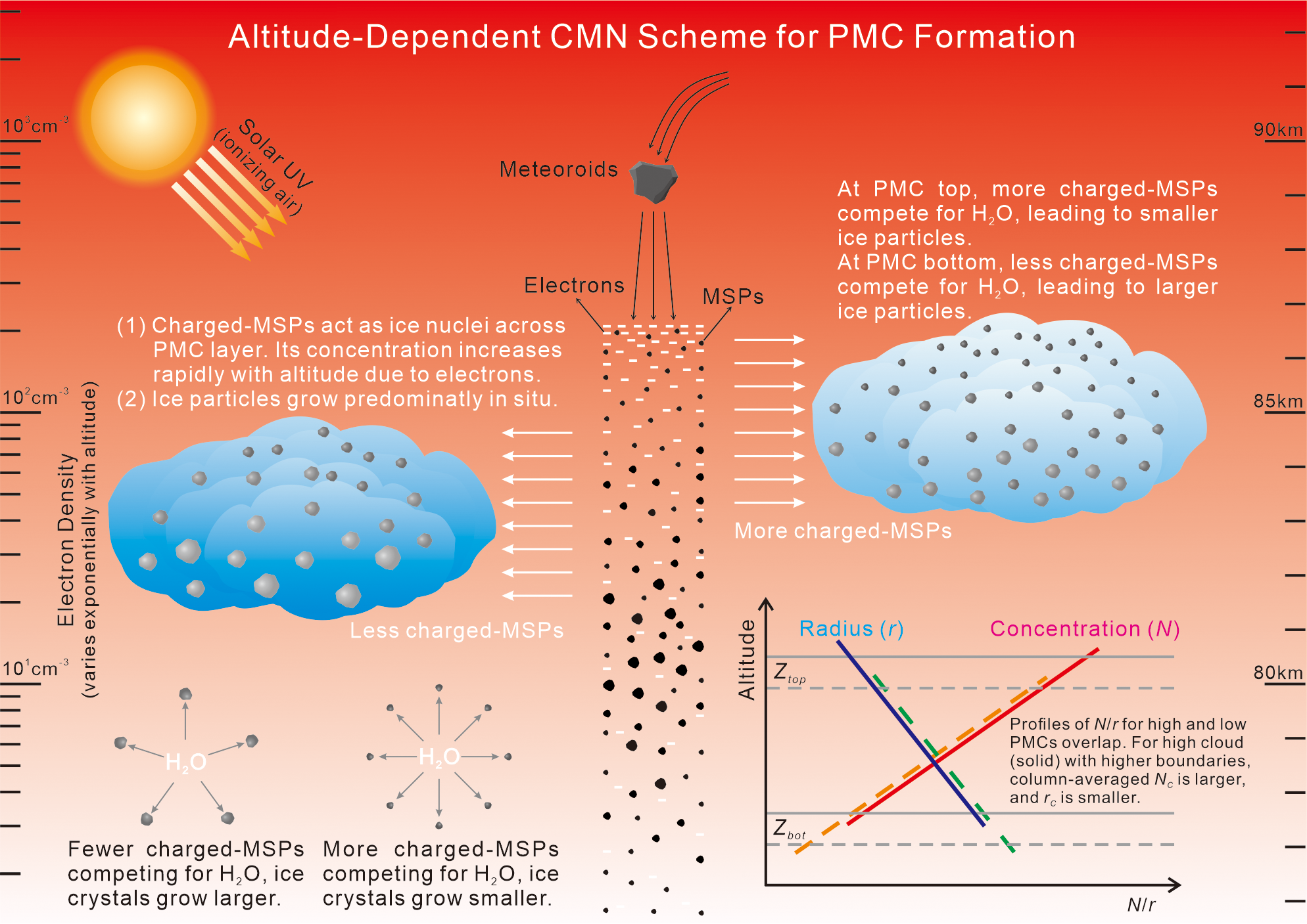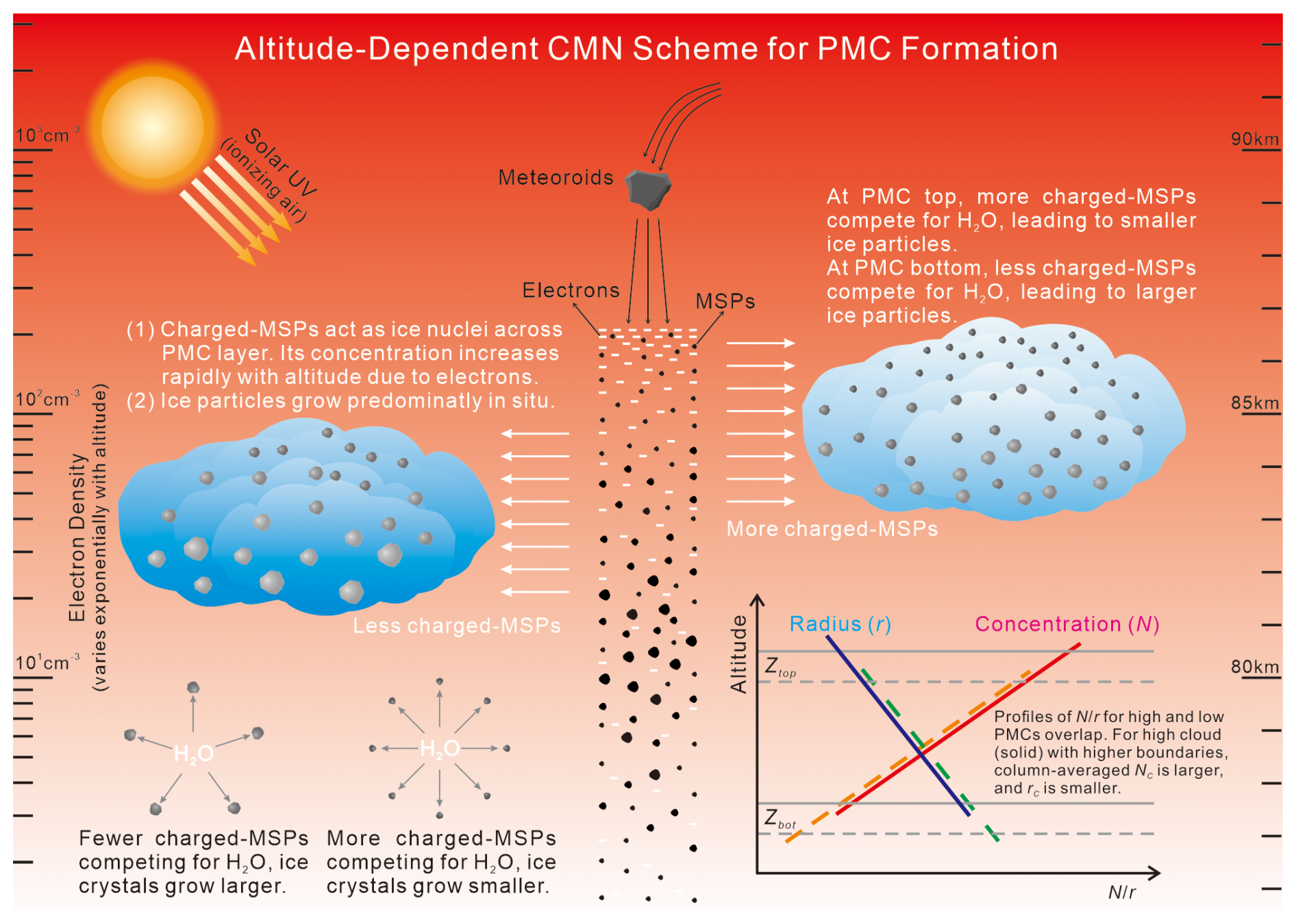 Building upon the demonstrated control of PMC height h over ice particle microphysics, we propose a novel altitude-dependent framework for PMC formation, termed as the charged-MSPs nucleation scheme. In contrast to the well-established GS scheme, which has been validated for individual PMC, the charged-MSP nucleation (CMN) scheme is a statistical model designed to explain zonal and daily-mean scale PMC properties. The CMN scheme rests on two foundational premises illustrated in Fig. 11: (1) Ubiquitous ice nucleation by charged-MSPs throughout the supersaturated zone. The charged-MSPs, though small, are abundant in upper mesosphere, whose concentration increases rapidly with altitude due to the distribution of electrons produced by solar UV ionization. Their electric charges enhance water molecule attraction, effectively lowering the energy barrier for ice nucleation (Gumbel and Megner, 2009; Megner and Gumbel, 2009). It is important to note that although charged-MSPs are proposed as the most plausible ice nuclei in this study, the CMN framework can be generalized to other potential candidates – such as neutral MSPs or ion clusters – provided that their concentrations are abundant and increase sharply with altitude. (2) Dominantly in situ ice growth with negligible sedimentation effects. Ice particles grow continuously within their formation layer until the environment transitions from supersaturated to unsaturated, at which point the PMC reaches equilibrium with the surrounding environment (Christensen et al., 2016; Hervig et al., 2009b). The cloud dissipation is not driven by particle fallout but by a rapid large-scale thermodynamic disruption, which raises local temperatures above the saturation threshold and leads to instantaneous sublimation throughout the cloud layer.