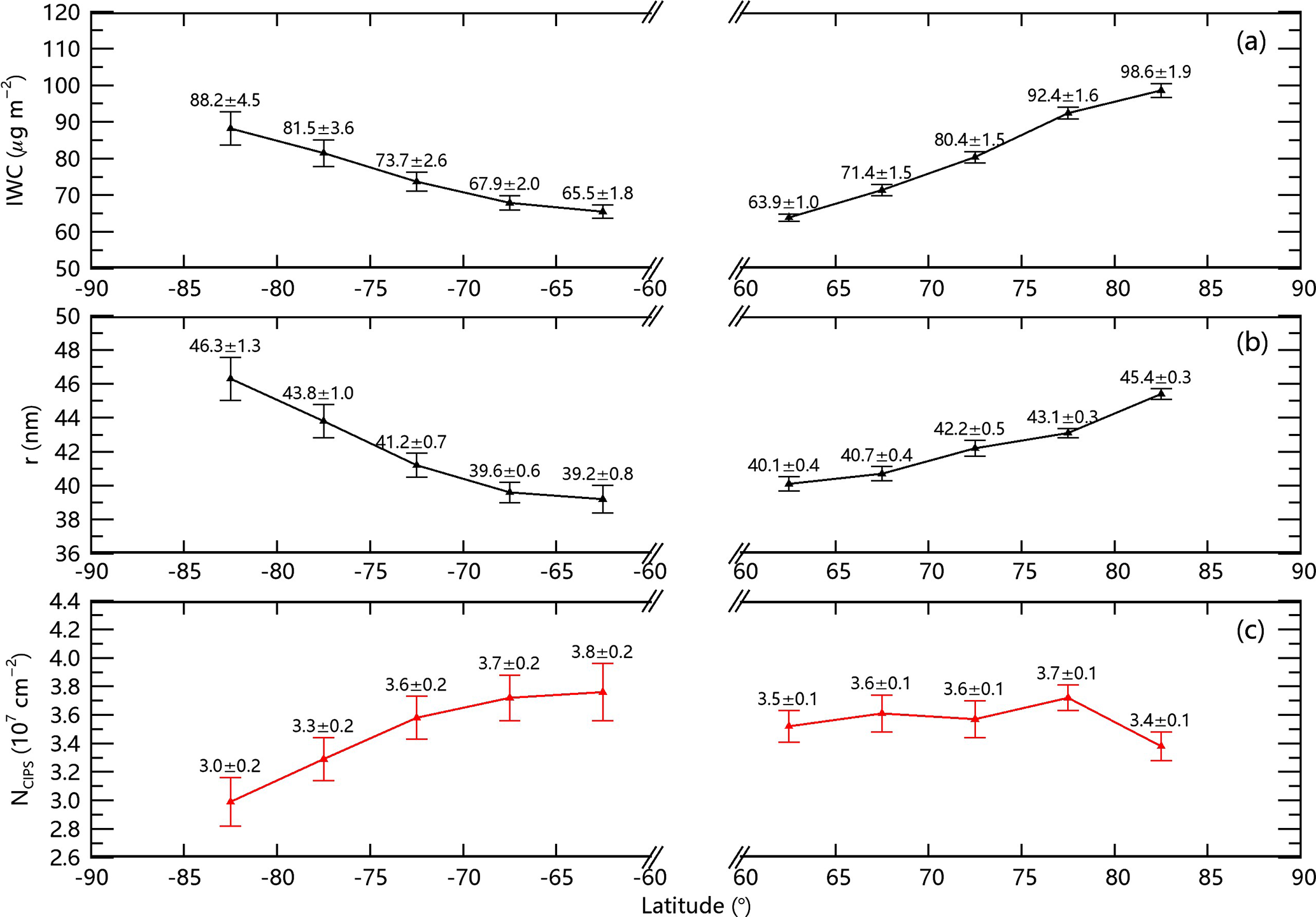 Analysis of CIPS/AIM observations reveals distinct latitudinal gradients in PMC properties from 60 to 85° in both hemispheres (Fig. 1). Consistent with theoretical expectations, IWC and ice particle radius exhibit positive latitudinal gradients in both hemispheres (Fig. 1a–b), reflecting enhanced cloud formation under the colder temperatures and elevated H2O mixing ratios at higher latitudes. However, the SH displays a surprising negative gradient in column ice particle concentration (NCIPS), directly contradicting predictions from the conventional GS framework (Fig. 1c). While the GS mechanism predicts increasing NCIPS with latitude due to extended particle residence times in thicker cloud layers, the observed SH trend challenges this paradigm and suggests limitations in current microphysical understanding. Notably, this anomalous pattern exhibits strong hemispheric asymmetry, as NH NCIPS values remain essentially latitude-independent.