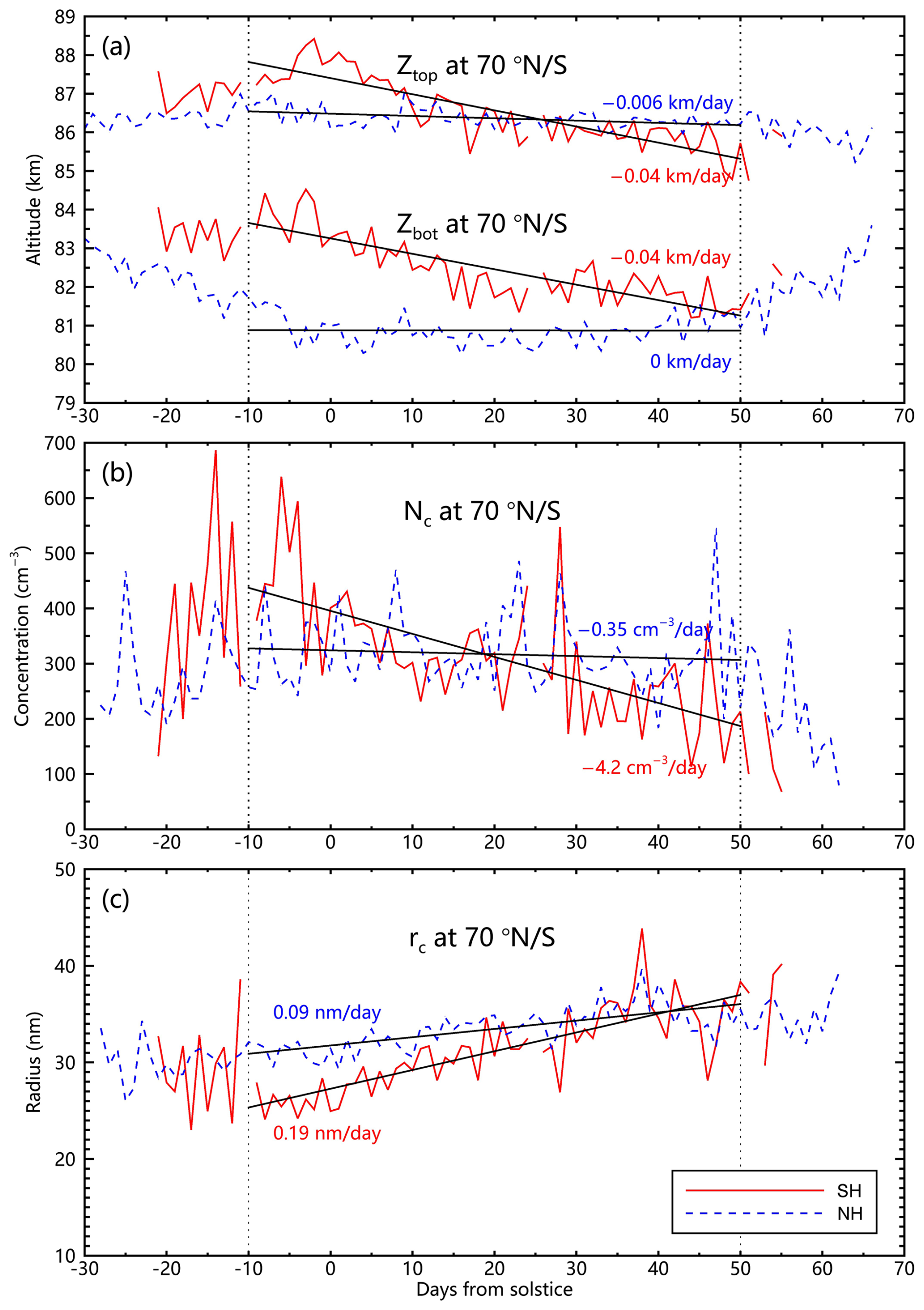 Figure 2Hemispheric differences in seasonal trends of PMC properties at ∼ 70° latitude: (a) Temporal evolution of cloud-top (Ztop) and cloud-base (Zbot) altitudes, (b) column-averaged ice particle concentration (Nc, averaged between the daily Zbot and Ztop), and (c) column-averaged ice particle radius (rc). Solid red and dashed blue lines denote SH and NH trends, respectively, based on SOFIE/AIM data (2007–2014) during core PMC season (−10 to +50 d relative to solstice).