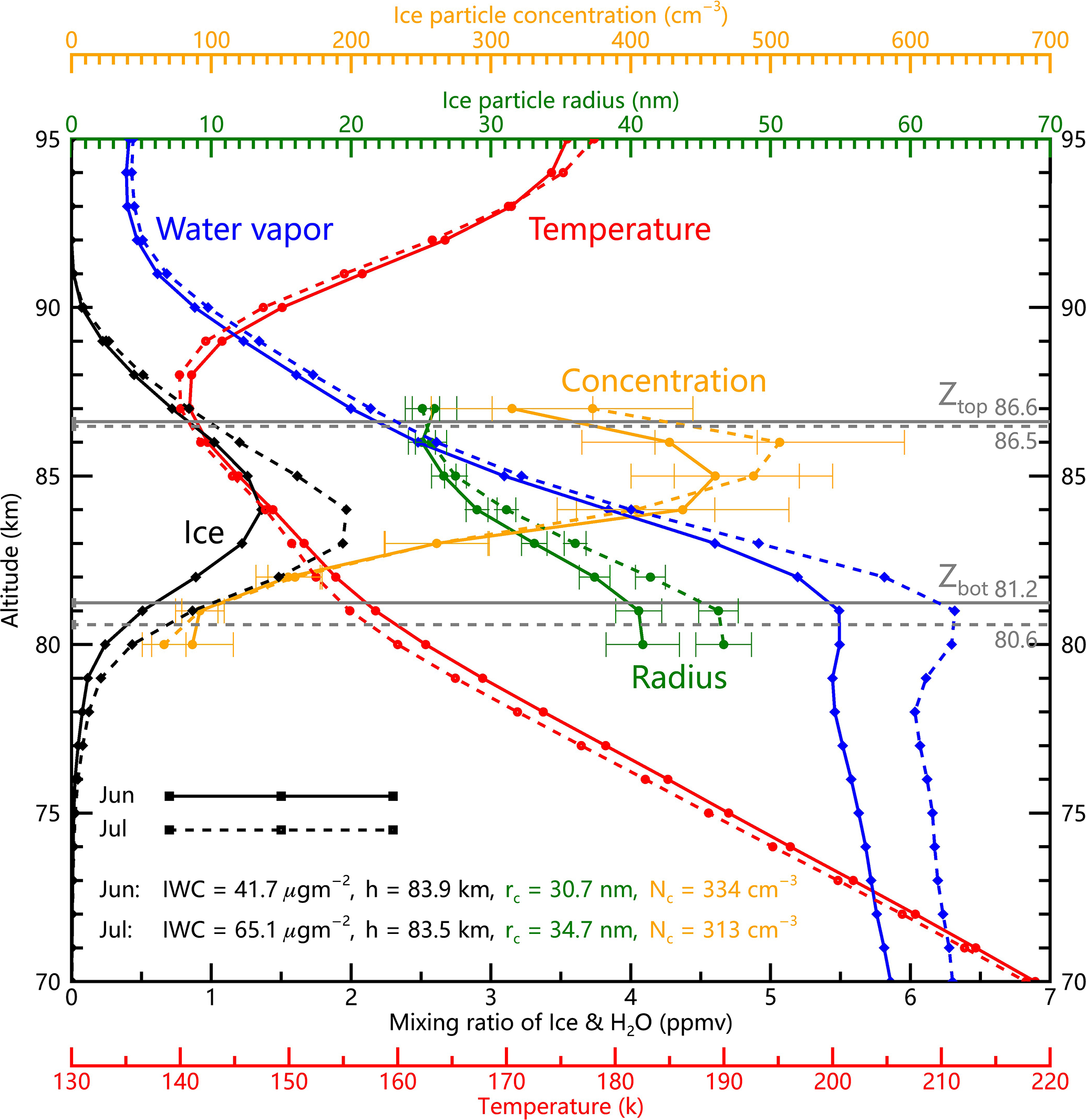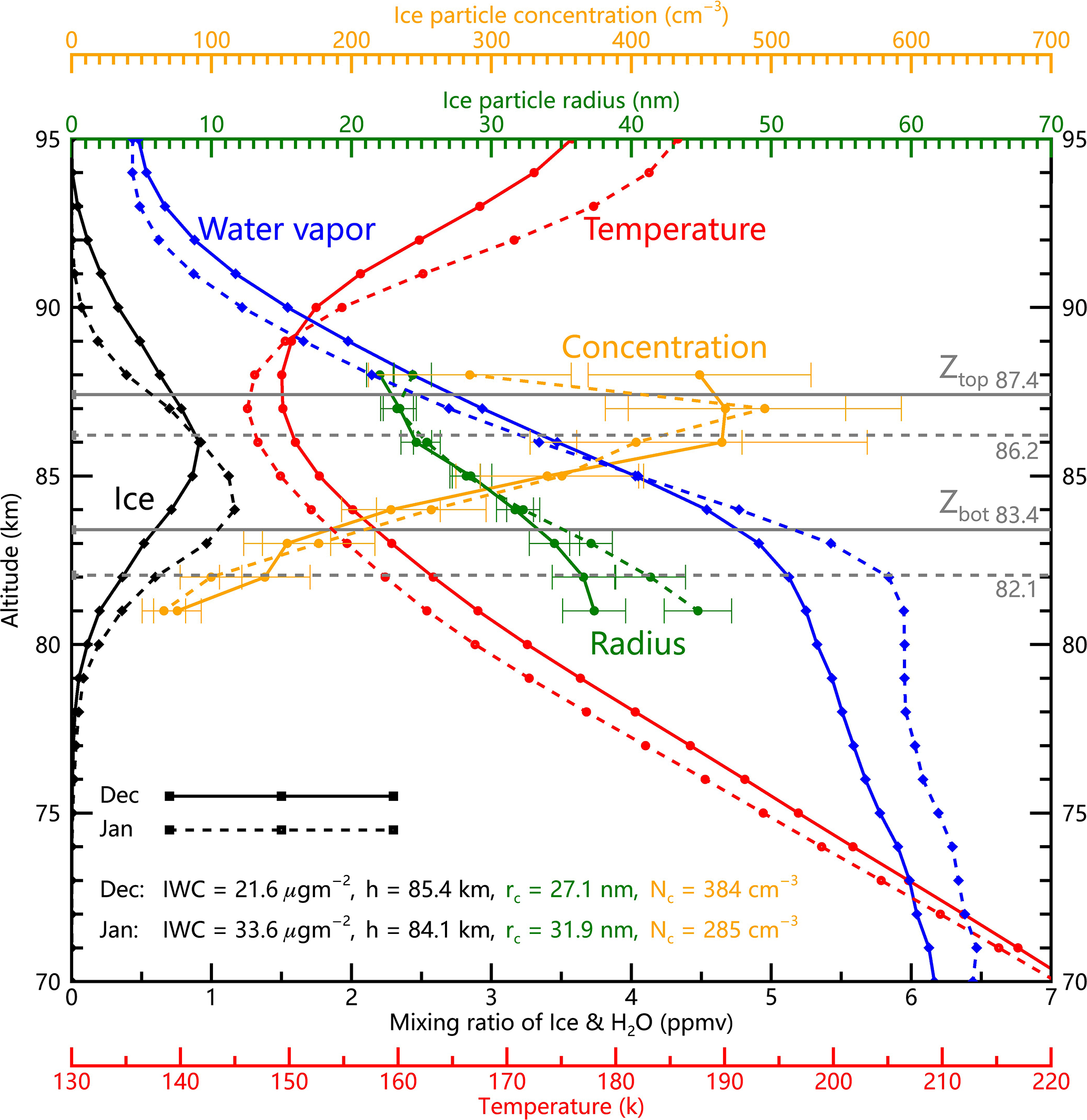 Figure 3Comparative vertical profiles of temperatures, H2O (water vapor) mixing ratio, ice (in unit of ppmv), ice particle concentration, and ice particle radius between December (solid lines) and January (dashed lines). The PMC height h is the mean of Ztop and Zbot. The column-averaged ice particle concentration Nc and radius rc are averaged between Zbot and Ztop. The data are observed by SOFIE/AIM at ∼ 70° S from 2007 to 2014.
