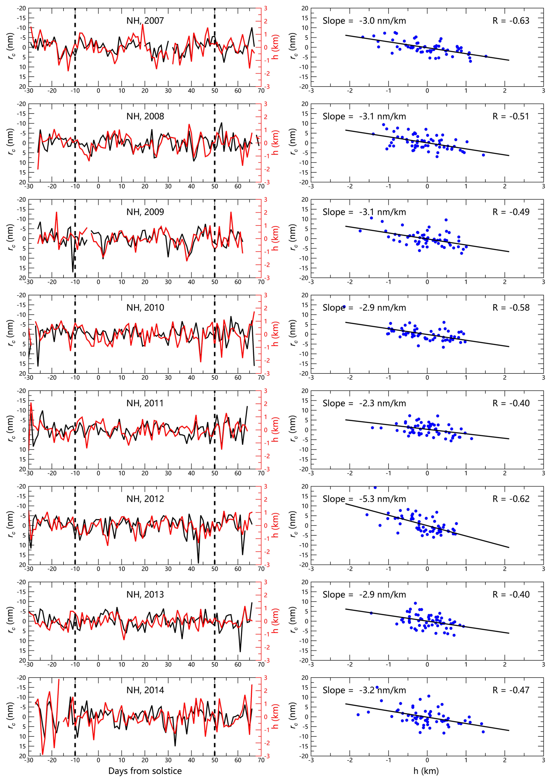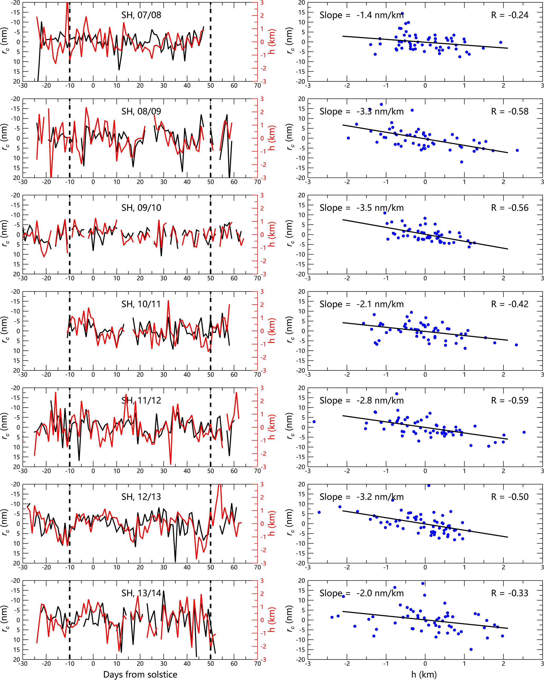 Figure 5Relationship between PMC height h and column-averaged ice particle radius rc in the NH applying SOFIE/AIM at ∼ 70° N (2007–2014): left panels display the rc (averaged between Zbot and Ztop) and h (the mean of Zbot and Ztop) after removing 35 d running means; right panels show corresponding correlation coefficients for the core PMC season (−10 to +50 d relative to solstice).