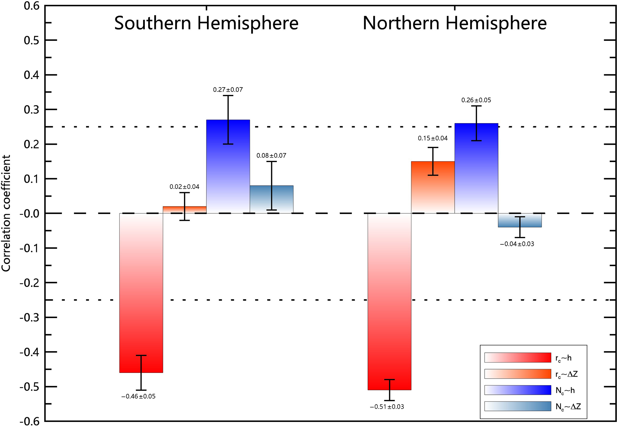 Figure 7Intercomparison of correlation coefficients between PMC microphysical parameters (Nc, rc) and cloud structural characteristics (h, ΔZ) for both hemispheres. The correlation coefficients between h andrc are shown in Figs. 5–6. All values derived from SOFIE/AIM data at ∼ 70° N/S during core PMC season (−10 to +50 d relative to solstice), with the 35 d running mean removed. The error bars represent the standard deviation of the mean across PMC seasons (2007–2014), and the dashed lines mark the 0.95 significant level.