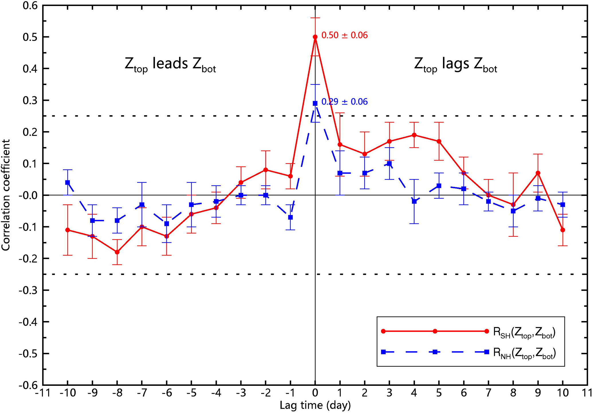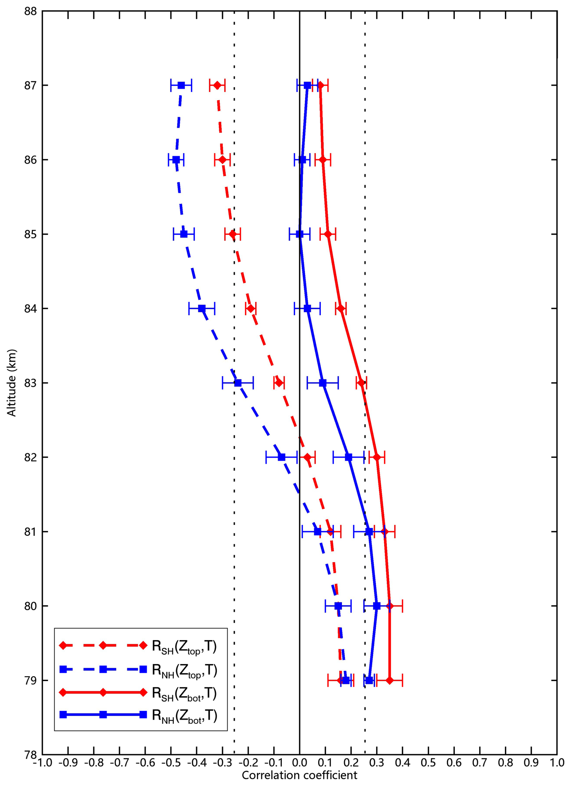Figure 15Lagged correlation between the PMC top (Ztop) and base (Zbot) altitudes in the SH and NH. The SOFIE/AIM data at ∼ 70° N/S from 2007 to 2014 during core PMC seasons (−10 to +50 d relative to solstice) were applied, with the 35 d running means removed. The error bars represent the standard deviation of the mean across PMC seasons (2007–2014), and the dashed lines mark the 0.95 significant level.