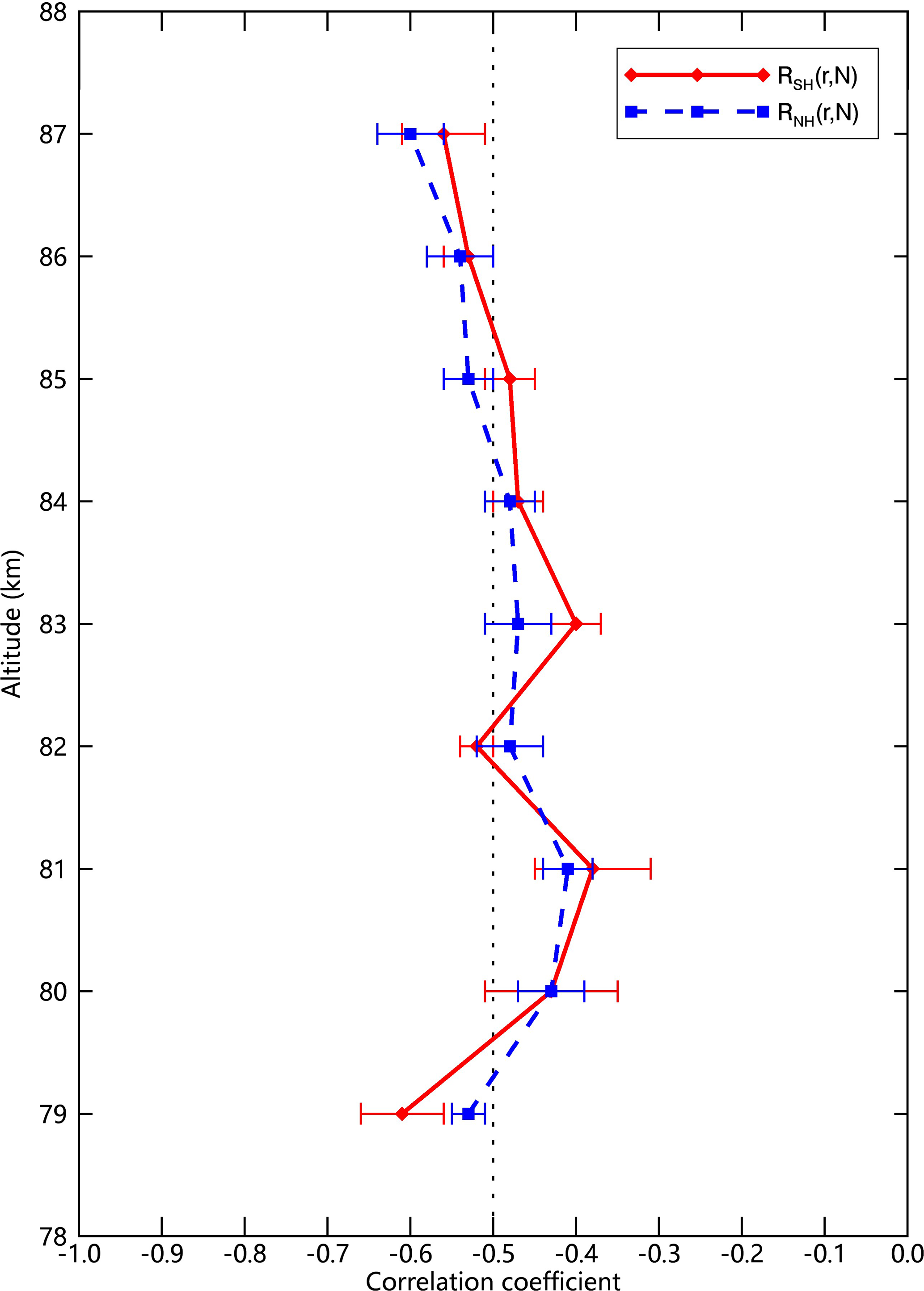 Figure 12Altitude-resolved anti-correlation between daily mean ice particle radius (r) and concentration (N) derived from SOFIE/AIM data at ∼ 70° N/S (2007–2014). The negative relationships across all altitude during core PMC season (−10 to +50 d relative to solstice) presumably support the CMN scheme's assumption of growth competition for limited H2O throughout PMC range. The error bars represent the standard deviation of the mean across PMC seasons (2007–2014), and the 35 d running means have been removed.